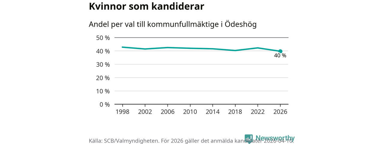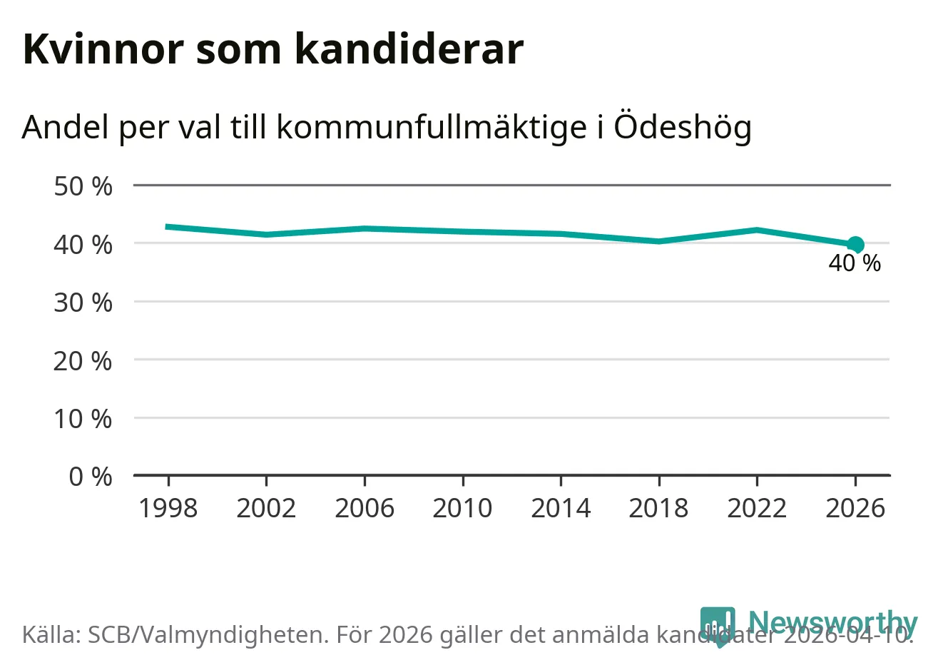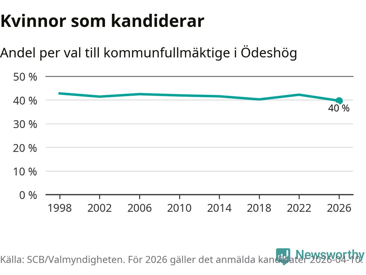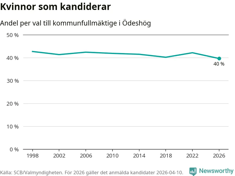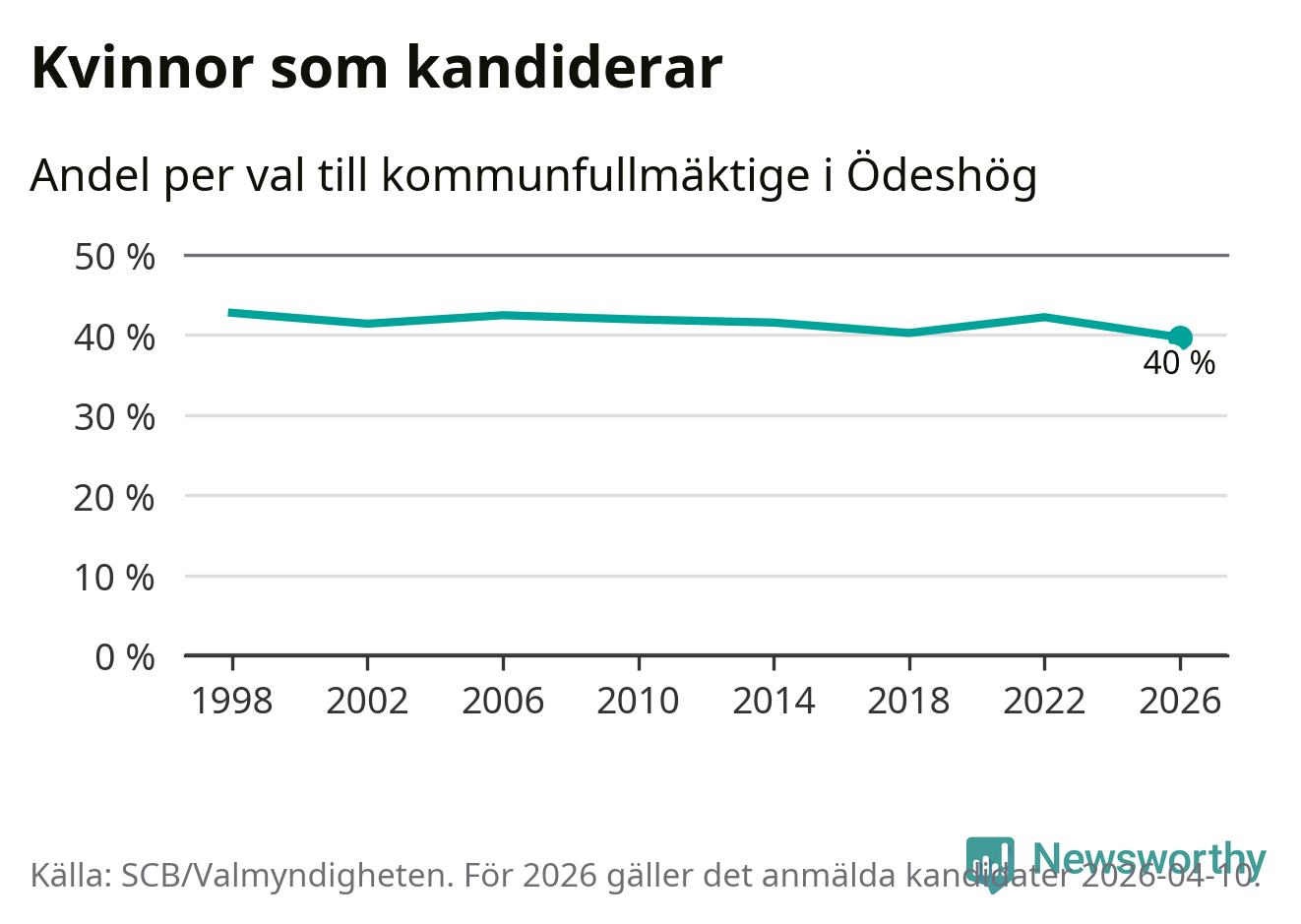 Kvinnorna utgör 40 procent av de hittills anmälda kandidaterna, vilket är den lägsta andelen på listorna till kommunfullmäktige i Ödeshög sedan åtminstone valet 1998. Ödeshög är en av 264 kommuner i landet där männen utgör en majoritet av kandidaterna på listorna.