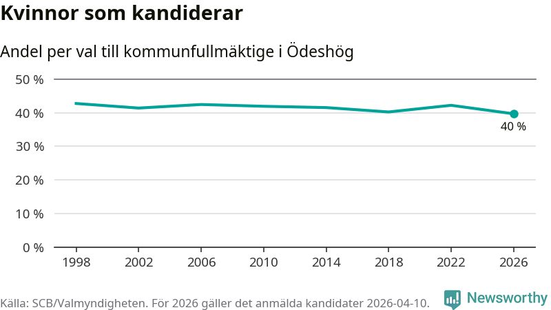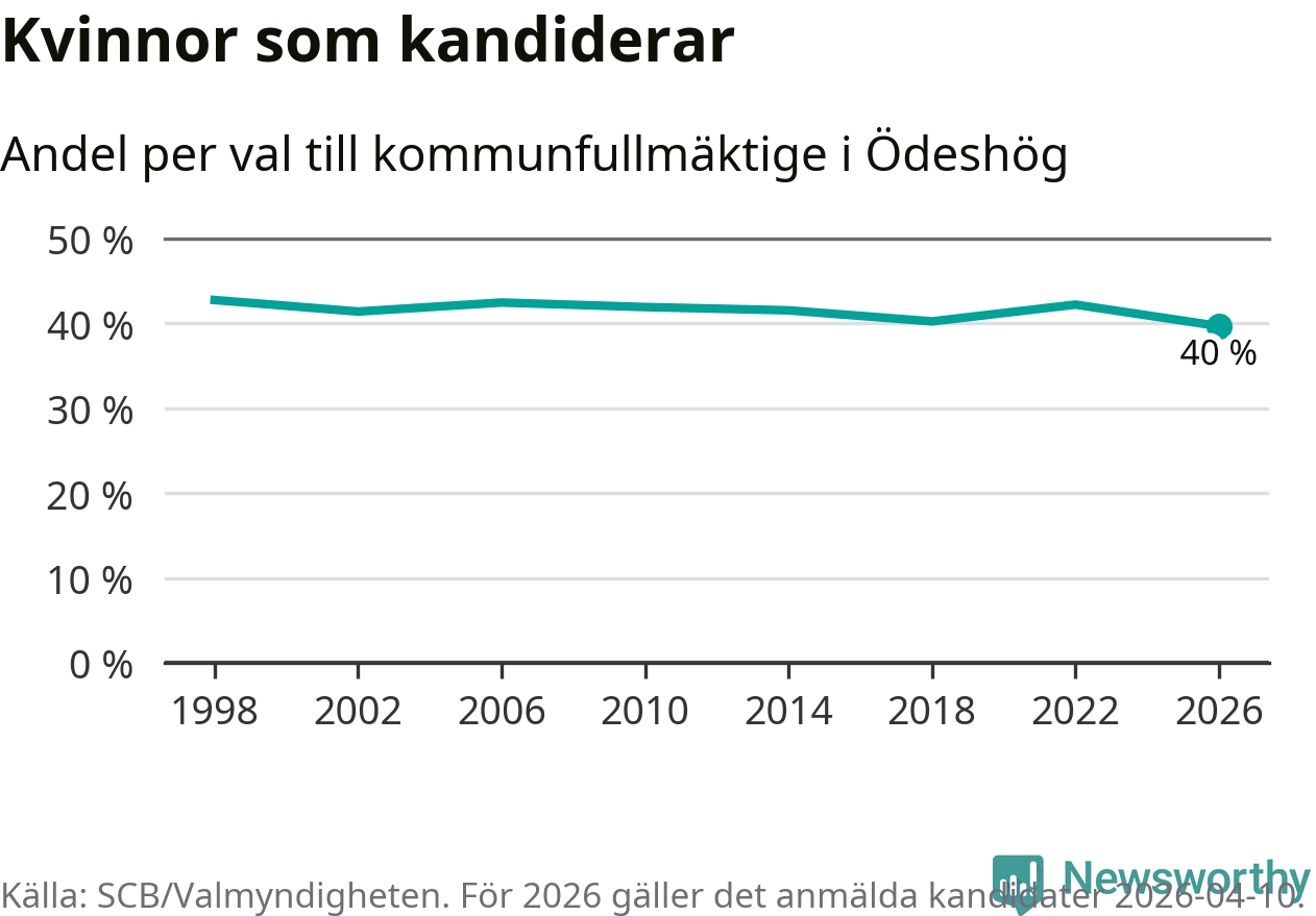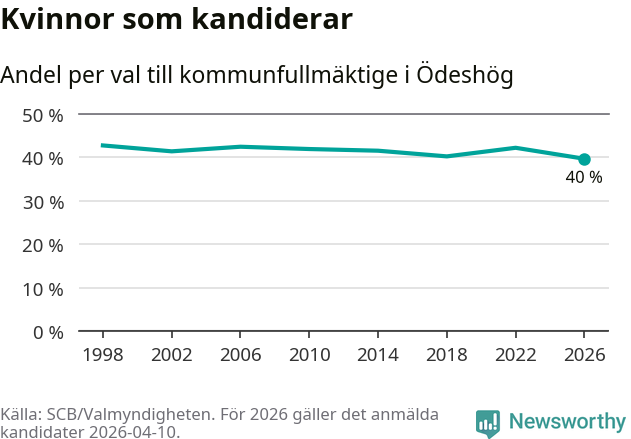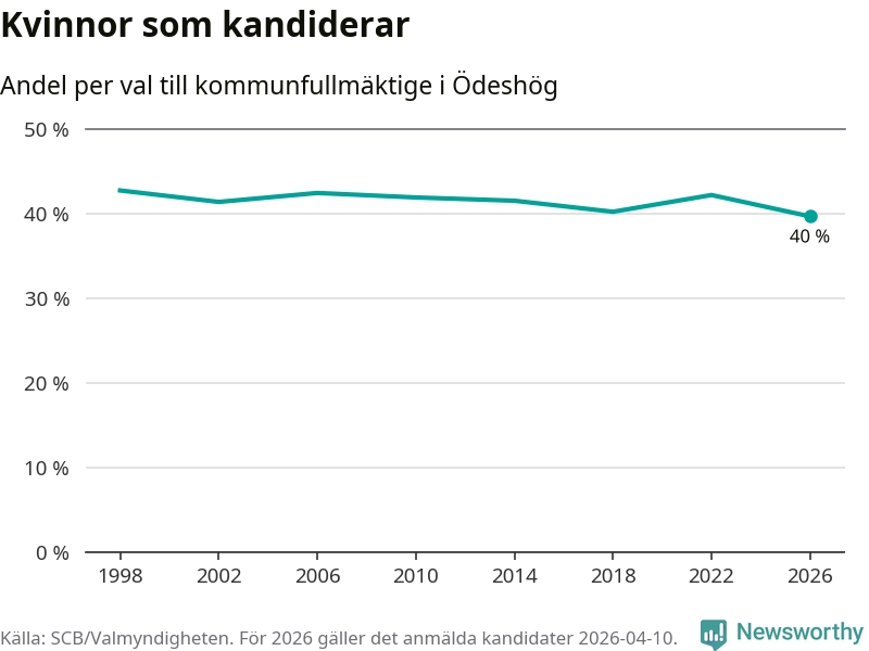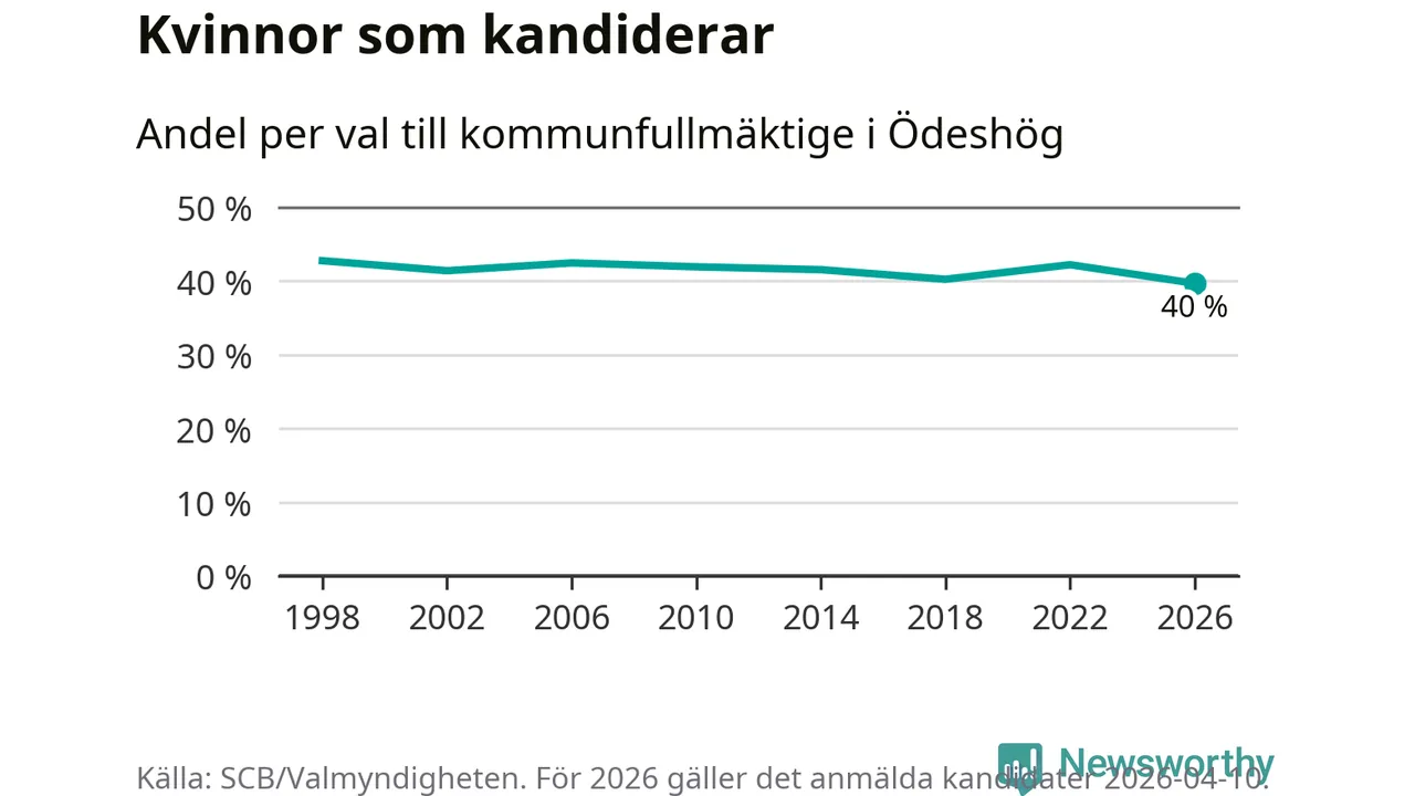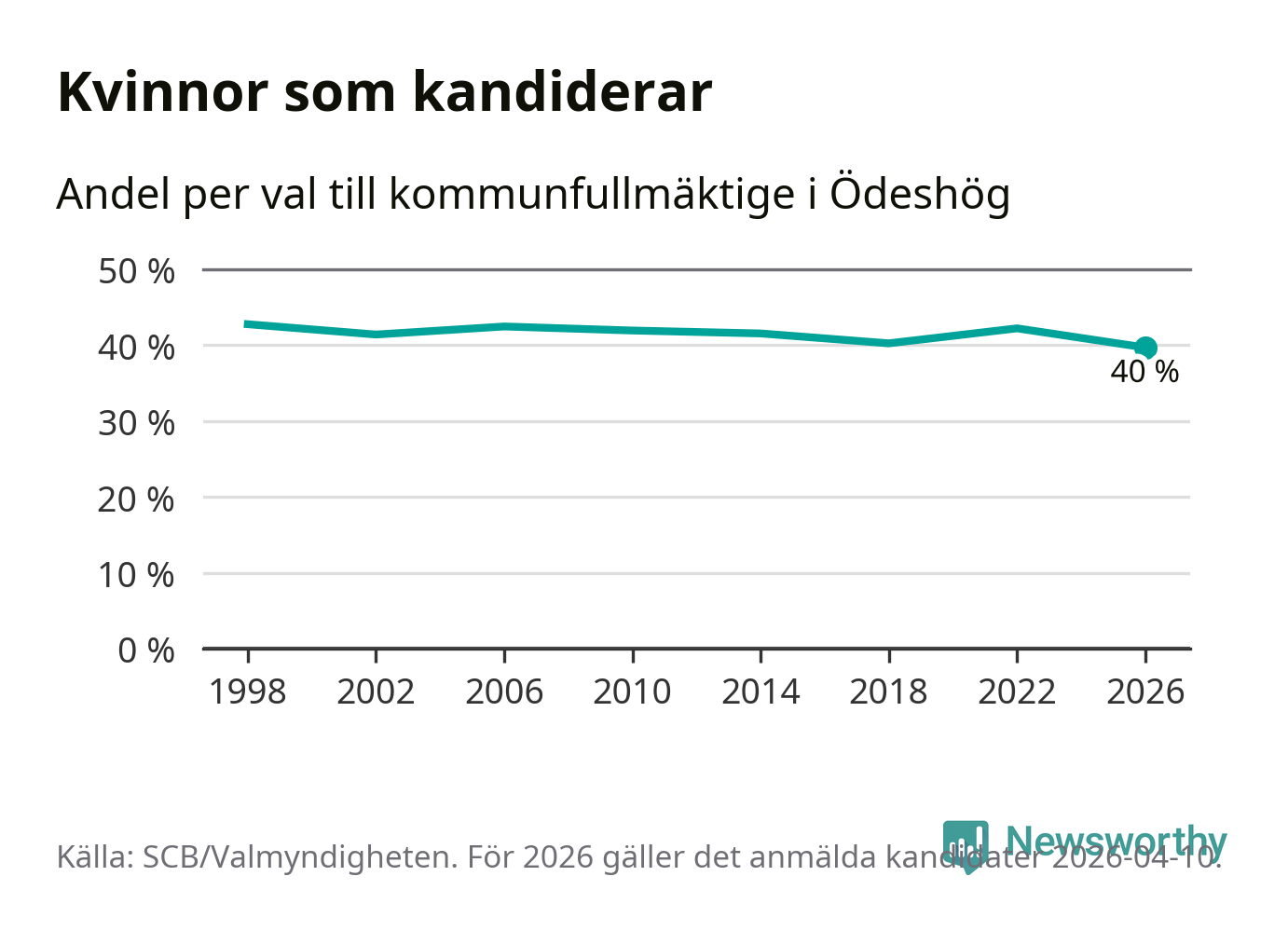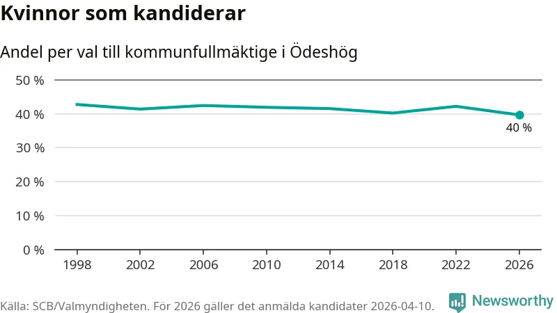 Kvinnorna utgör 40 procent av de hittills anmälda kandidaterna, vilket är den lägsta andelen på listorna till kommunfullmäktige i Ödeshög sedan åtminstone valet 1998. Ödeshög är en av 264 kommuner i landet där männen utgör en majoritet av kandidaterna på listorna.