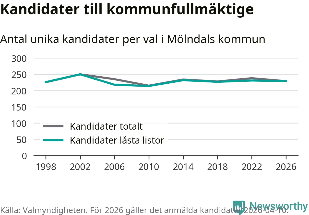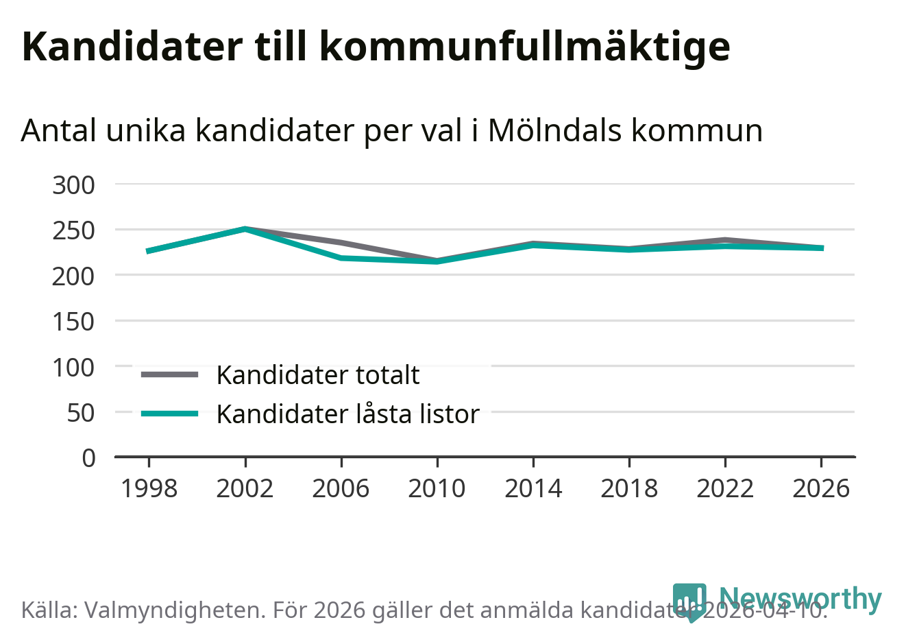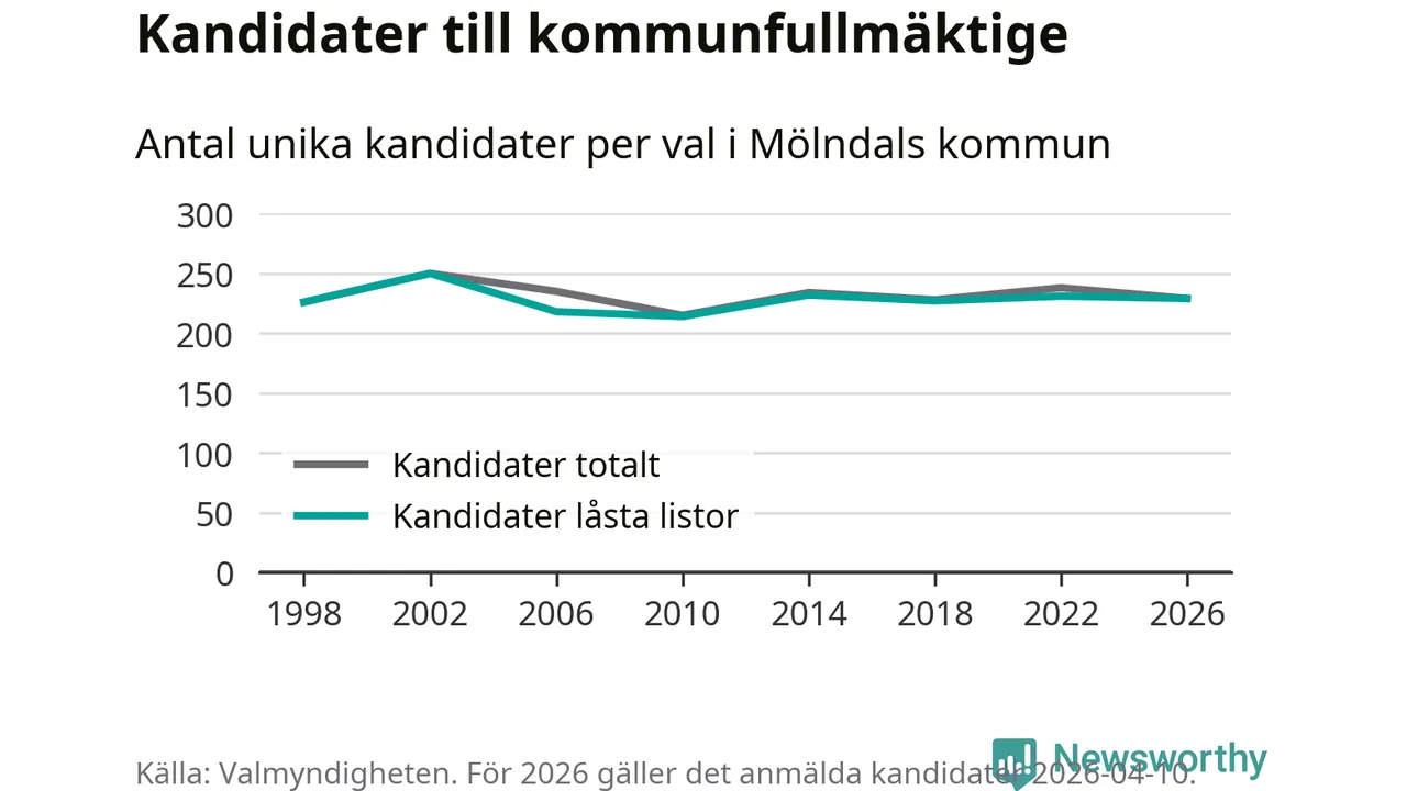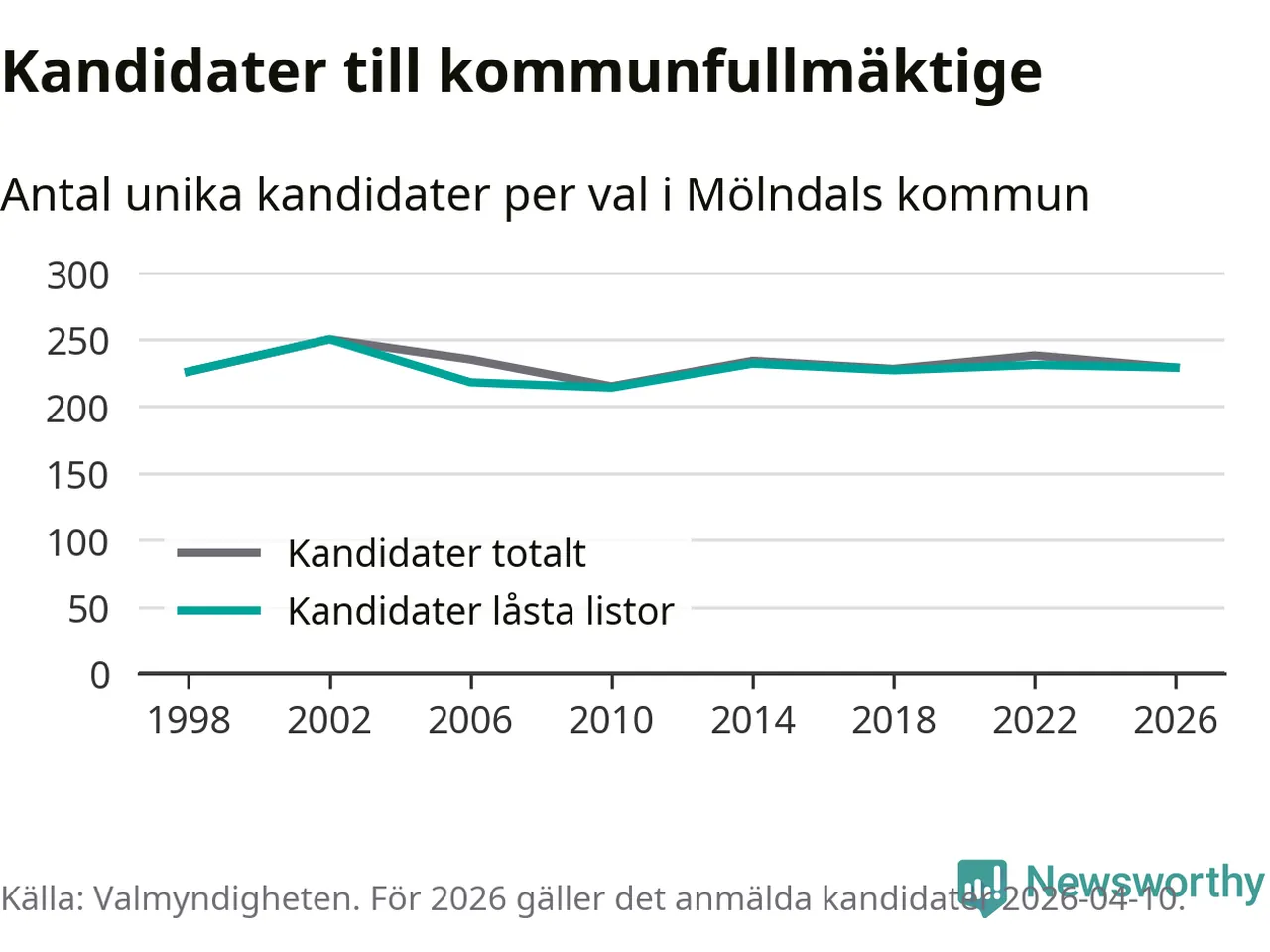 På torsdagen var det deadline för partier med låsta listor att registrera sina kandidater inför höstens val. Till valet till kommunfullmäktige i Mölndal är 229 kandidater anmälda på sådana listor, vilket är två färre än i valet 2022.