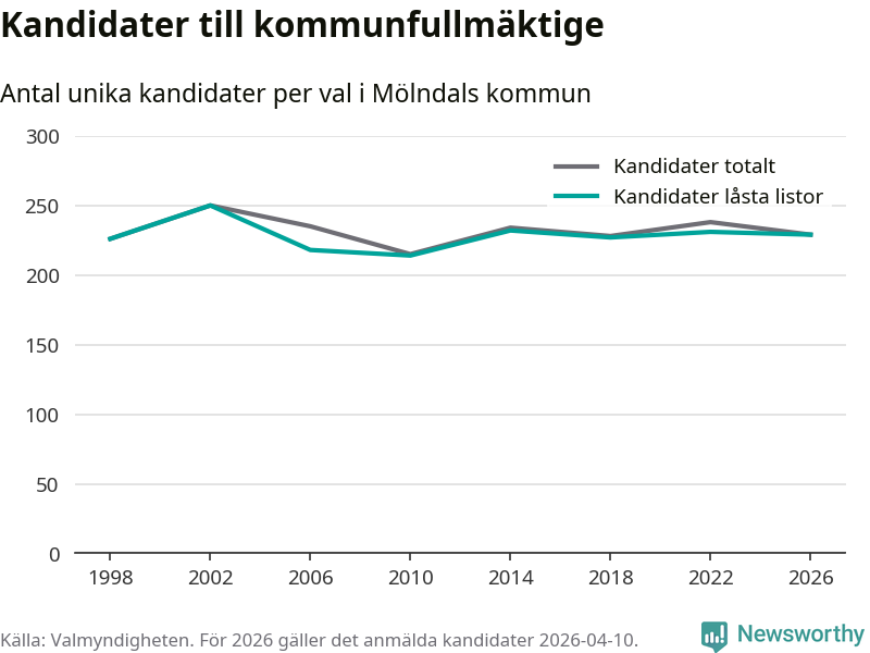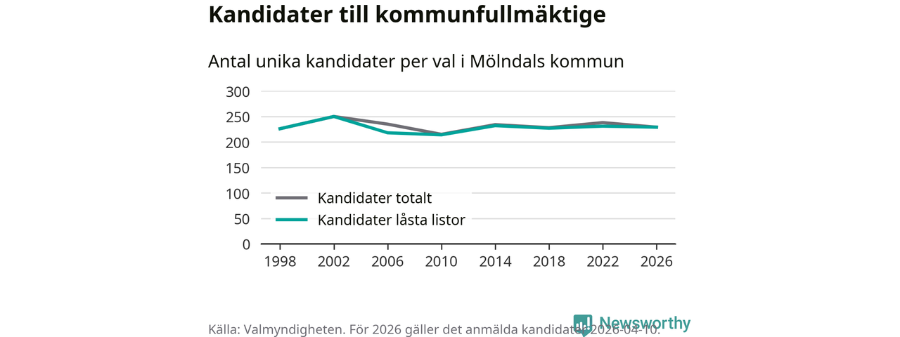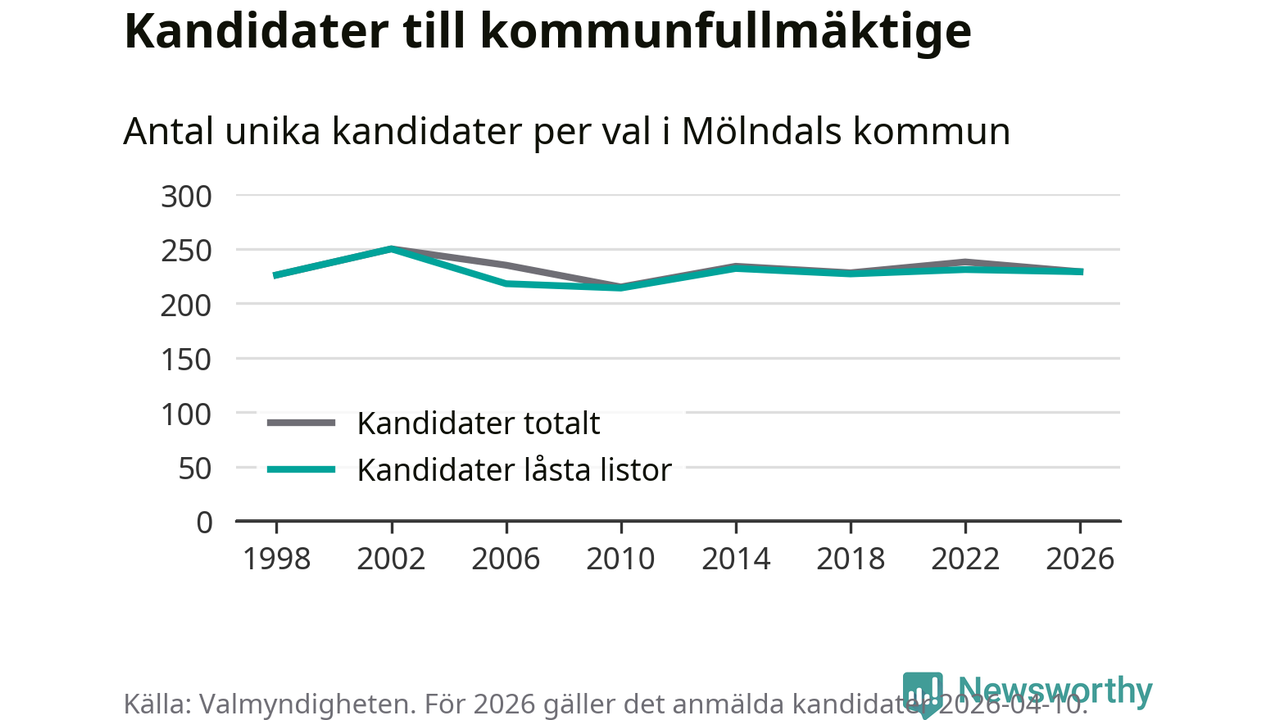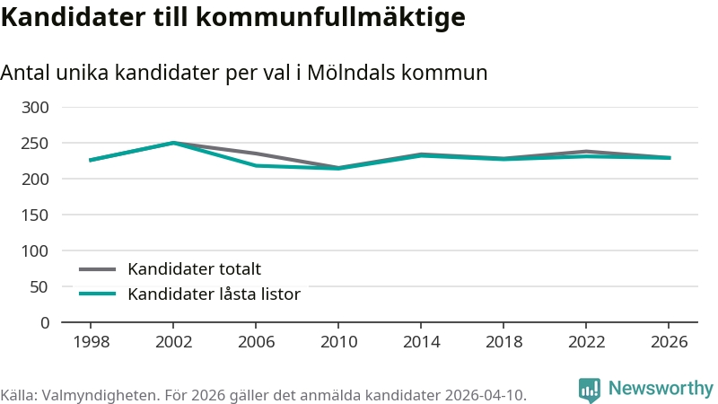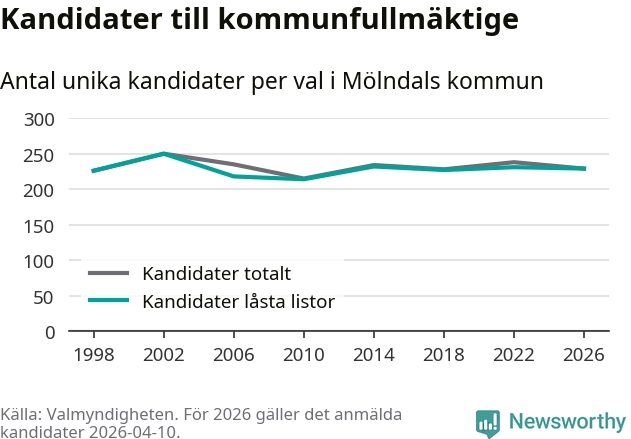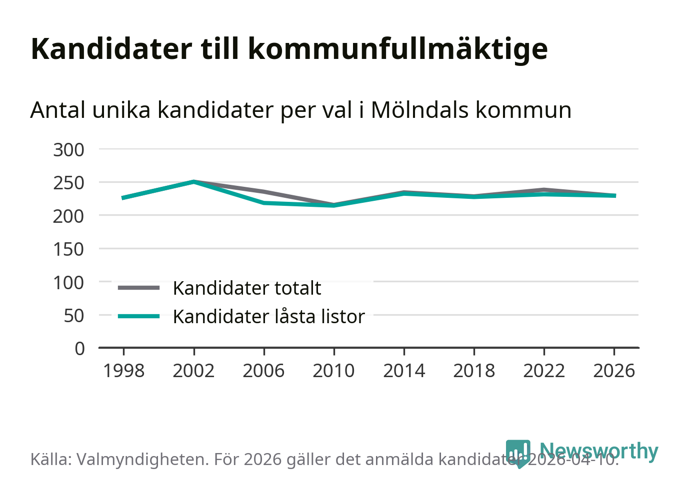 På torsdagen var det deadline för partier med låsta listor att registrera sina kandidater inför höstens val. Till valet till kommunfullmäktige i Mölndal är 229 kandidater anmälda på sådana listor, vilket är två färre än i valet 2022.