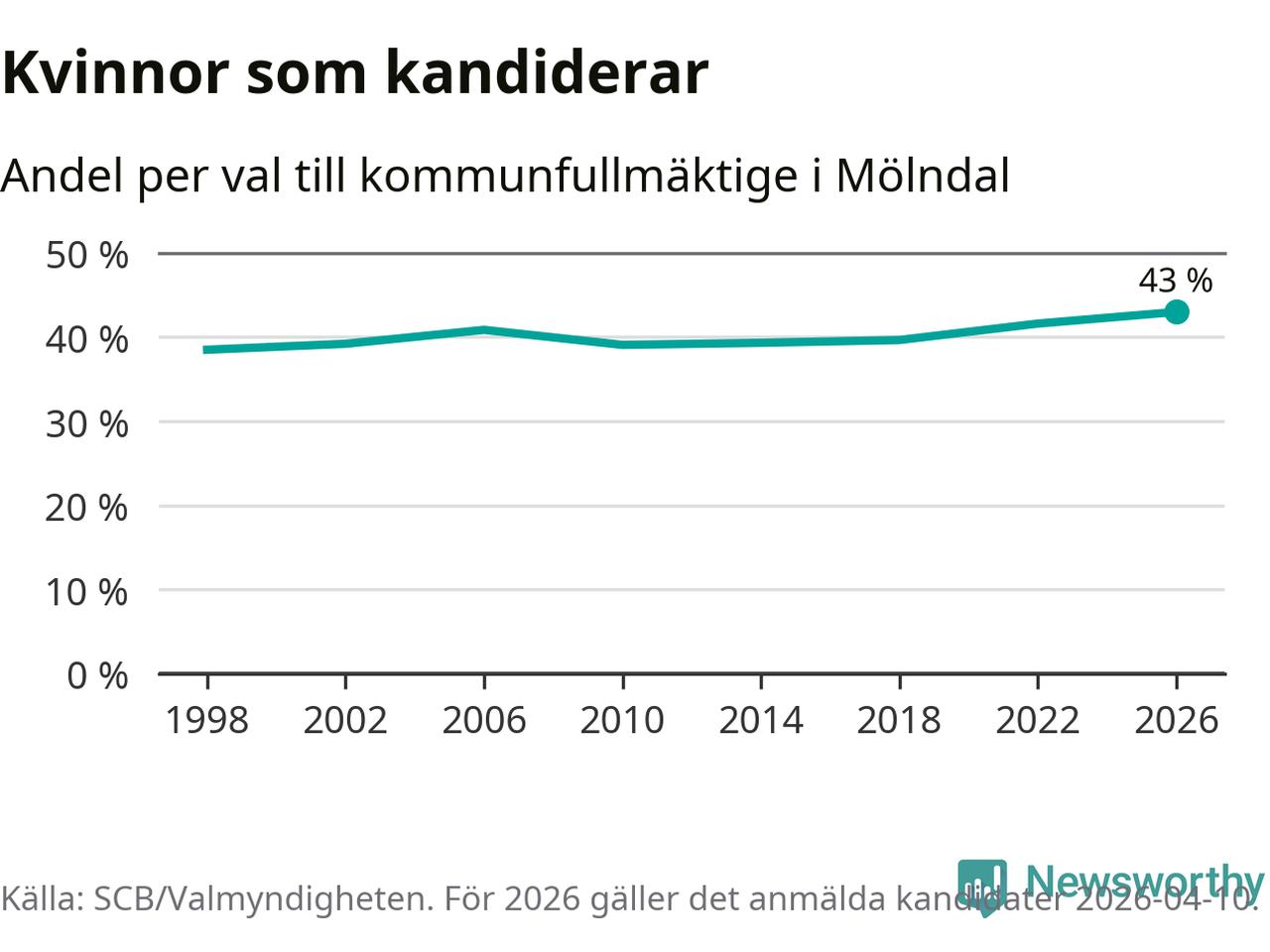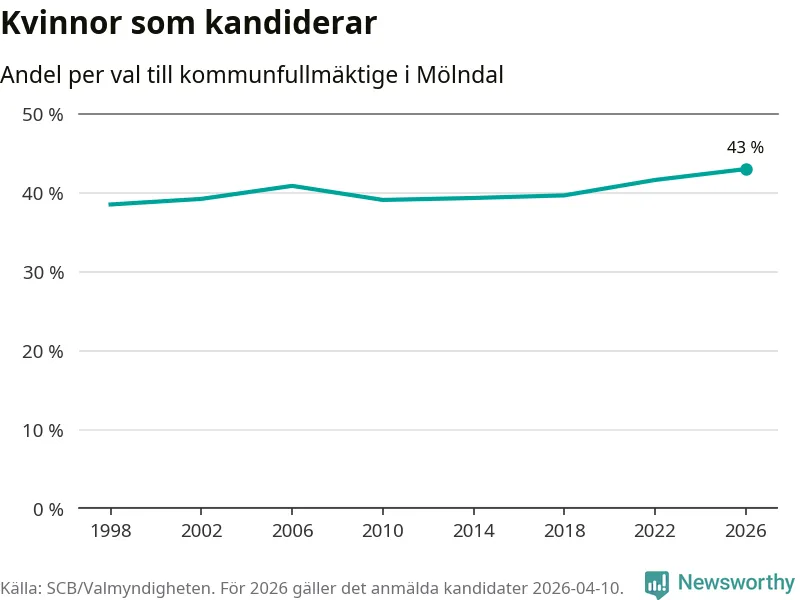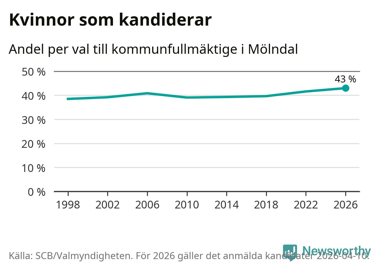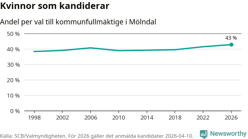 Kvinnorna utgör 43 procent av de hittills anmälda kandidaterna, vilket är den högsta andelen på listorna till kommunfullmäktige i Mölndal sedan åtminstone valet 1998. Andelen kvinnor har ökat i Mölndal under de senaste tre valen och ökningen ser alltså ut att fortsätta i år. Mölndal är en av 264 kommuner i landet där männen utgör en majoritet av kandidaterna på listorna.