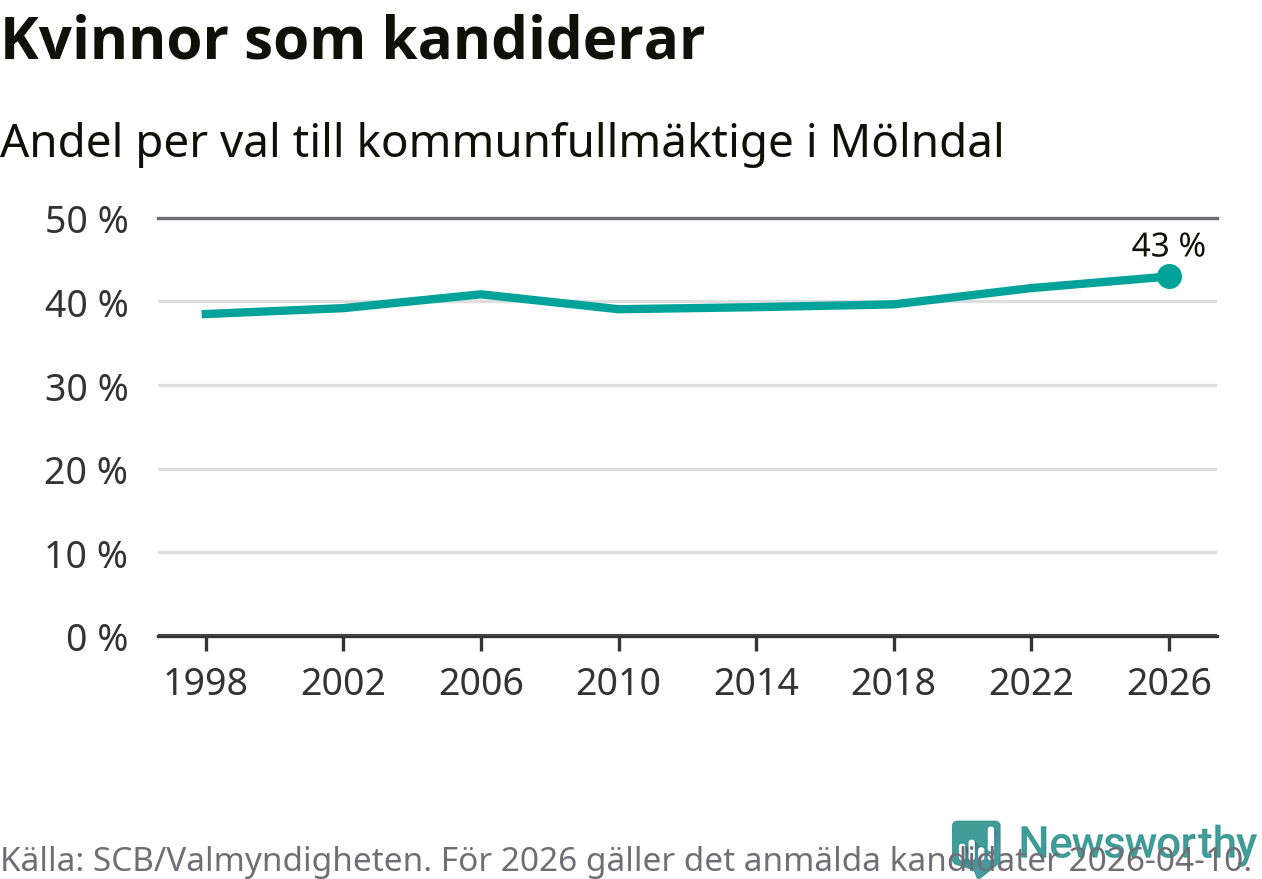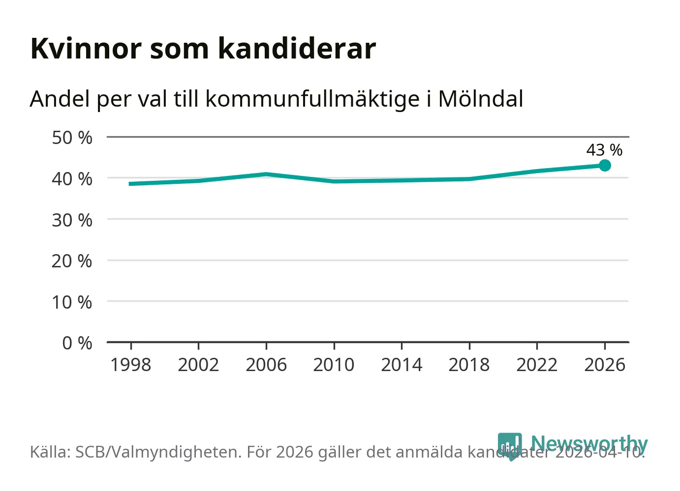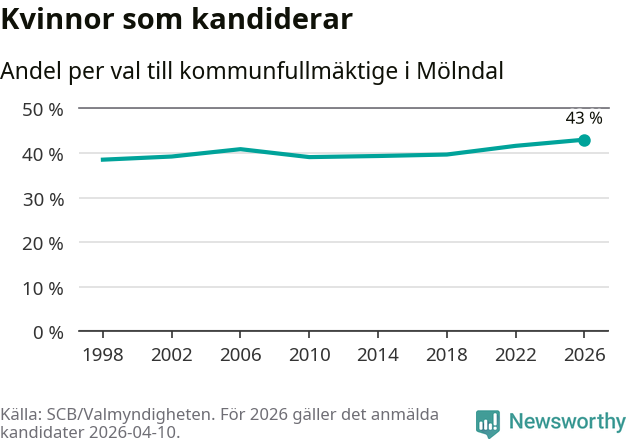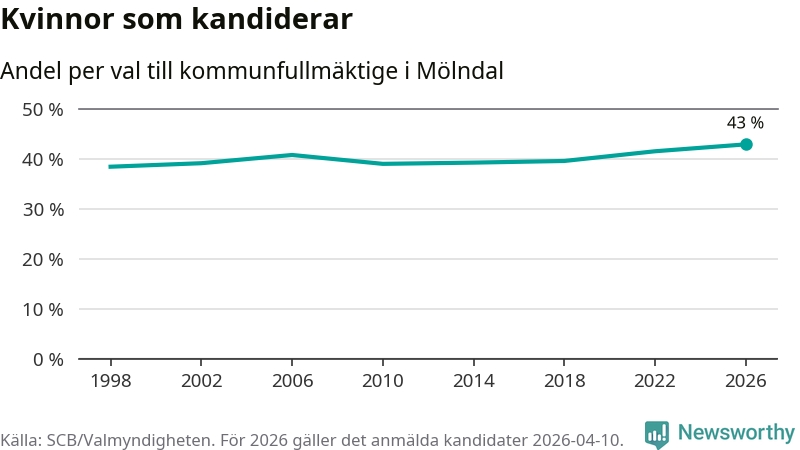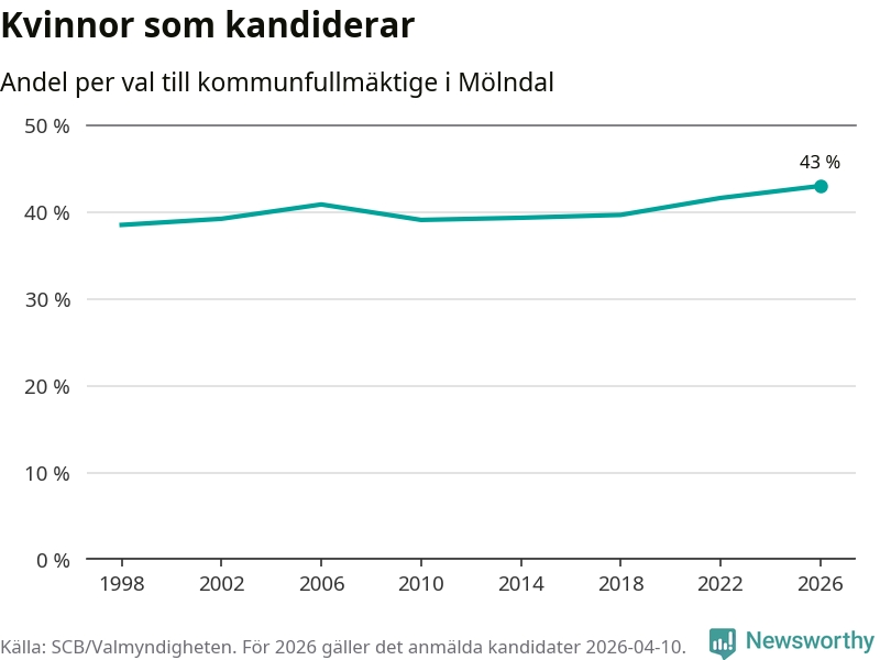 Kvinnorna utgör 43 procent av de hittills anmälda kandidaterna, vilket är den högsta andelen på listorna till kommunfullmäktige i Mölndal sedan åtminstone valet 1998. Andelen kvinnor har ökat i Mölndal under de senaste tre valen och ökningen ser alltså ut att fortsätta i år. Mölndal är en av 264 kommuner i landet där männen utgör en majoritet av kandidaterna på listorna.