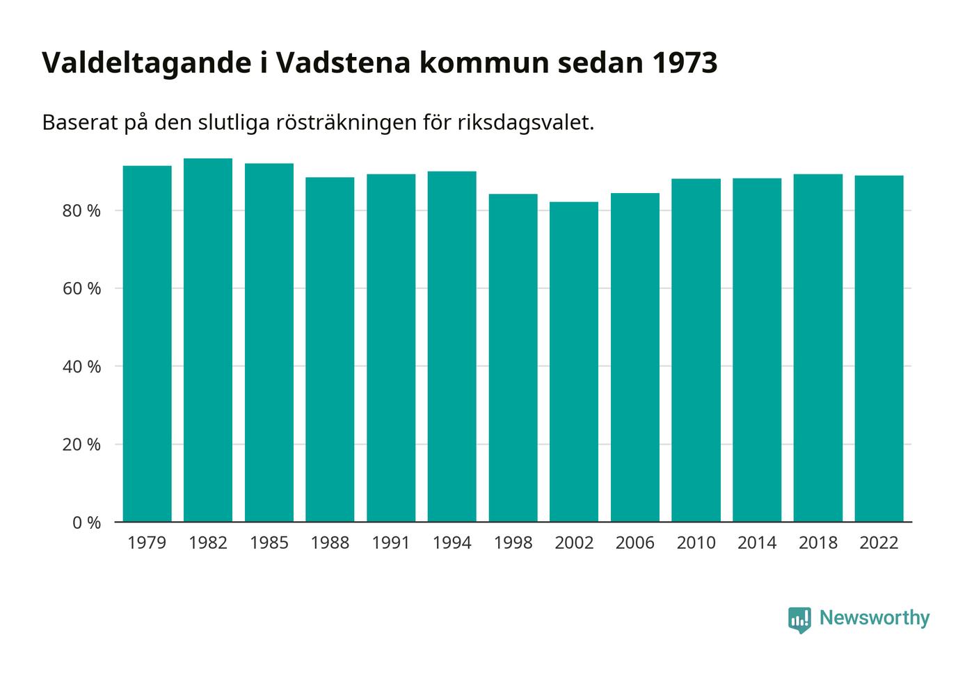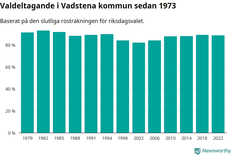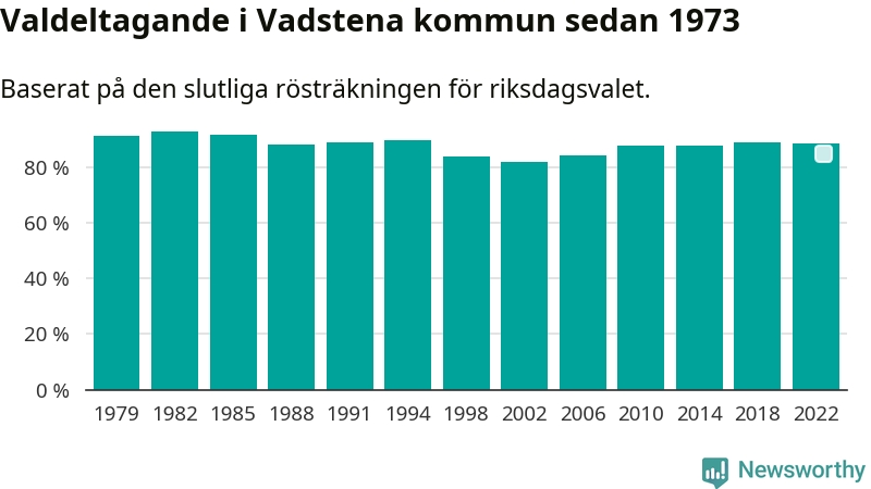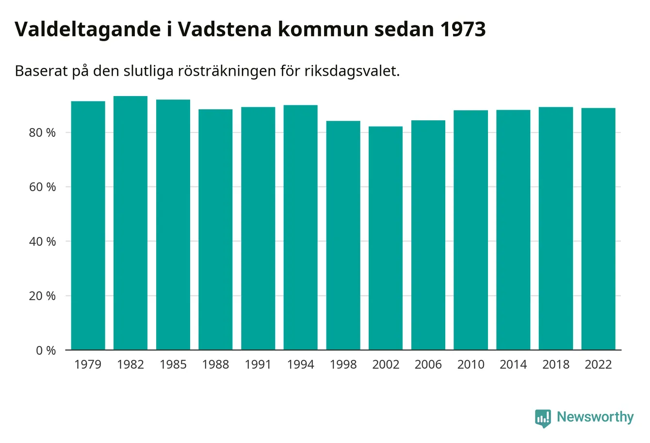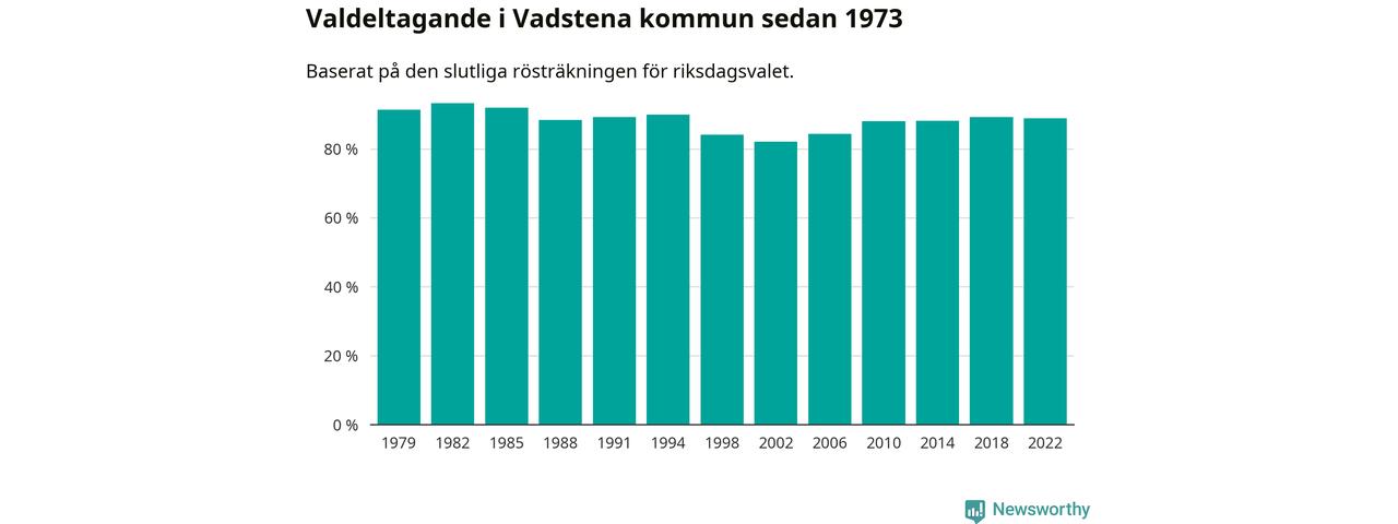 Vadstena tillhör Östergötlands läns valkrets. Där var valdeltagandet förra valet 85,3 procent. I hela riket landade valdeltagandet 2022 på 84,21 procent, att jämföra med 87,18 procent 2018.