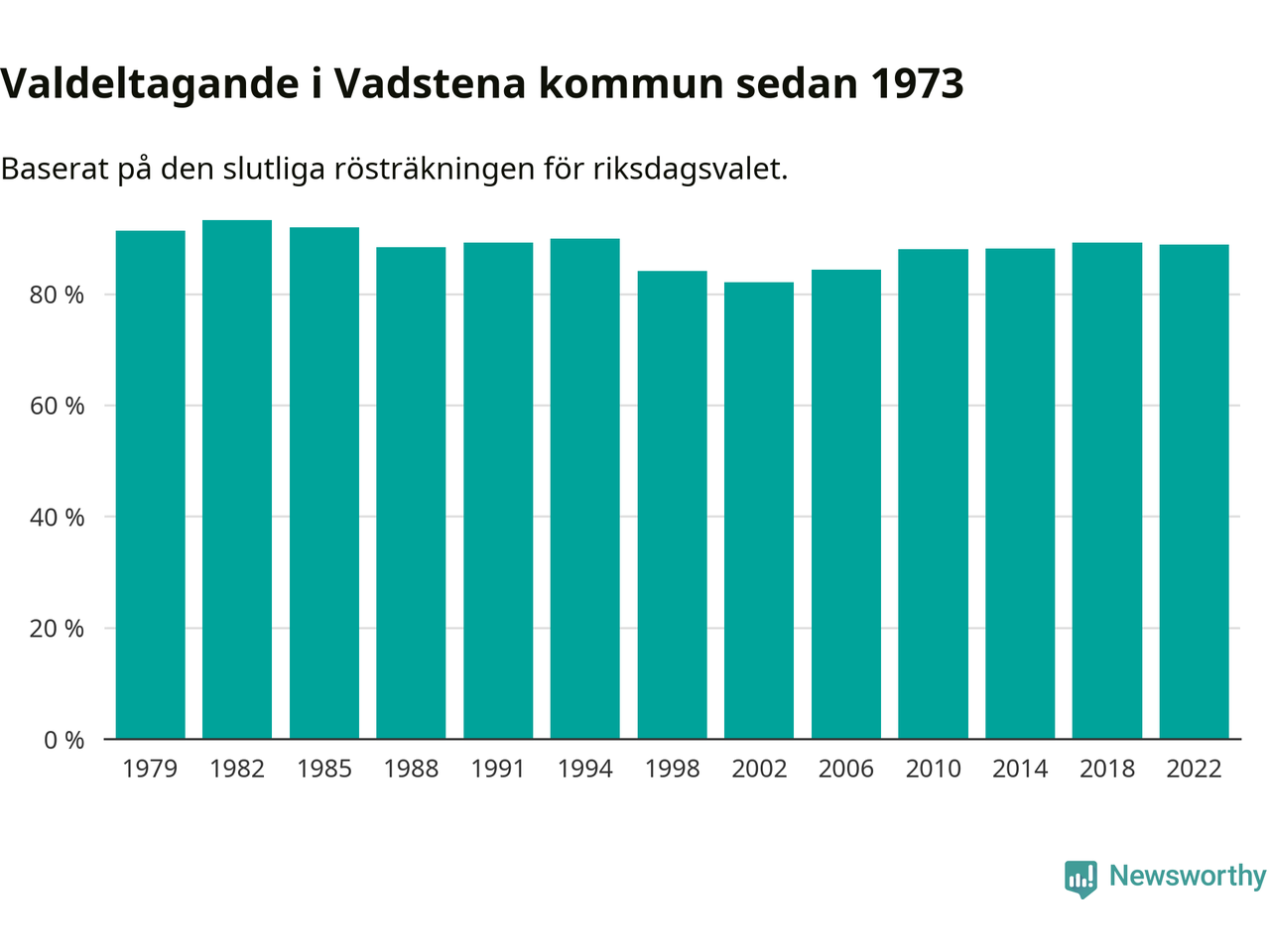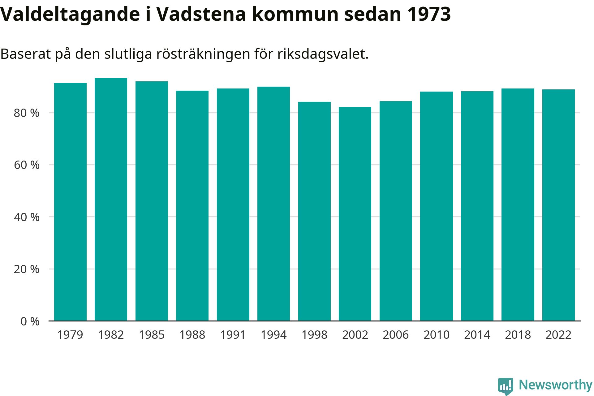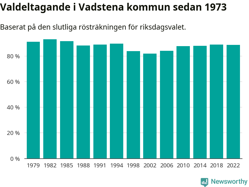 Vadstena tillhör Östergötlands läns valkrets. Där var valdeltagandet förra valet 85,3 procent. I hela riket landade valdeltagandet 2022 på 84,21 procent, att jämföra med 87,18 procent 2018.