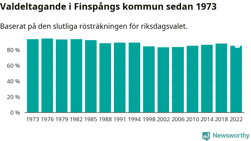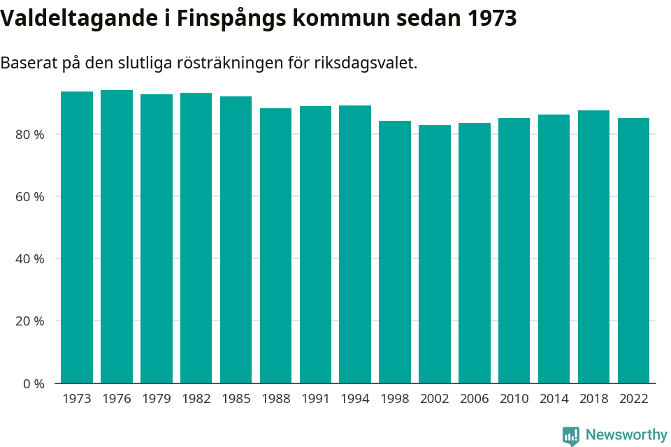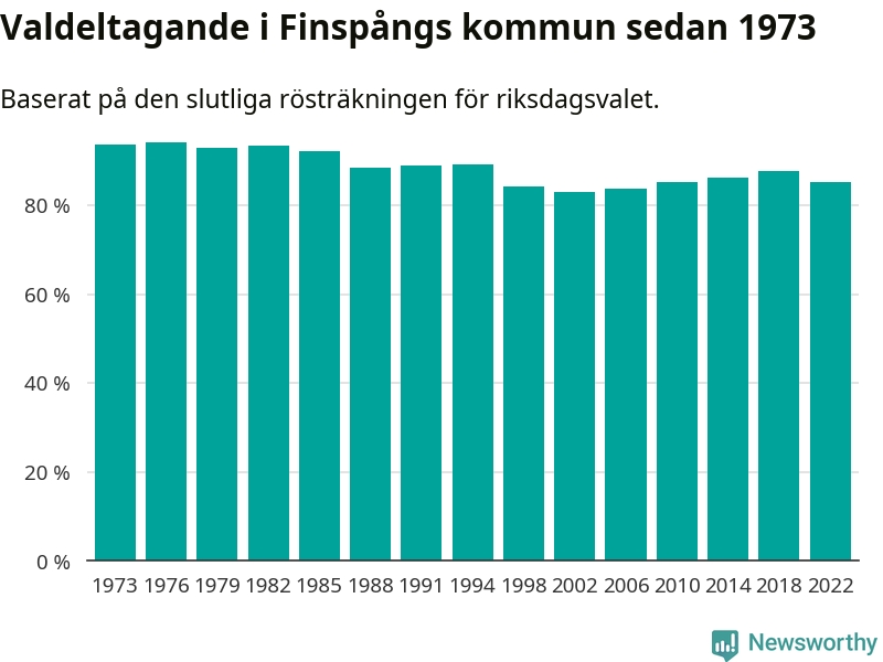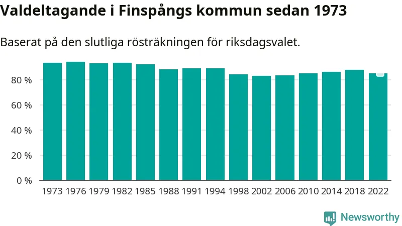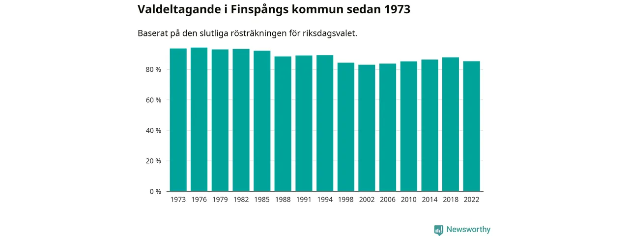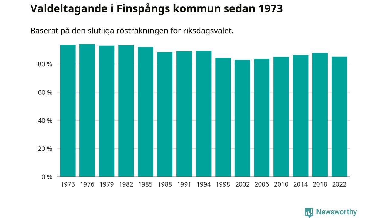 Finspång tillhör Östergötlands läns valkrets. Där var valdeltagandet förra valet 85,3 procent. I hela riket landade valdeltagandet 2022 på 84,21 procent, att jämföra med 87,18 procent 2018.