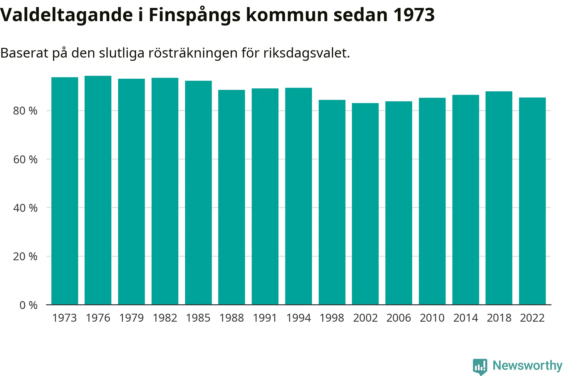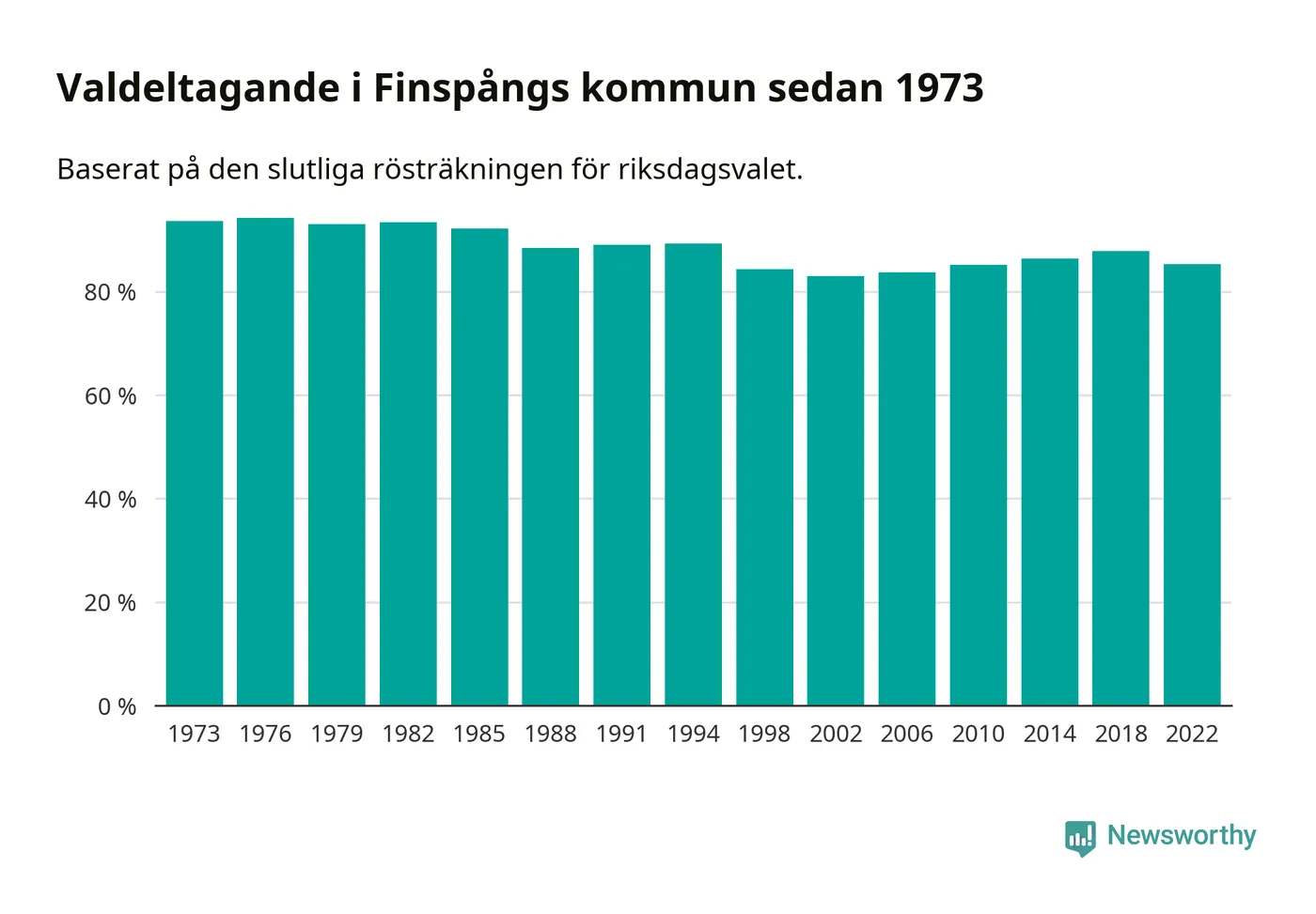 Finspång hade det näst lägsta valdeltagadet av alla kommuner i Östergötlands läns valkrets under 2022. Allra lägst var det i Norrköpings kommun, 82,6 procent, medan 89,6 procent röstade i Ydre kommun.