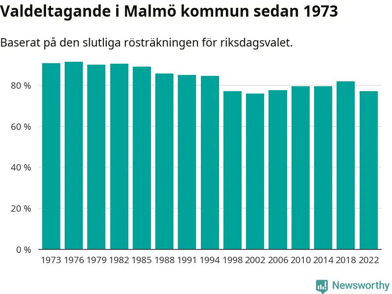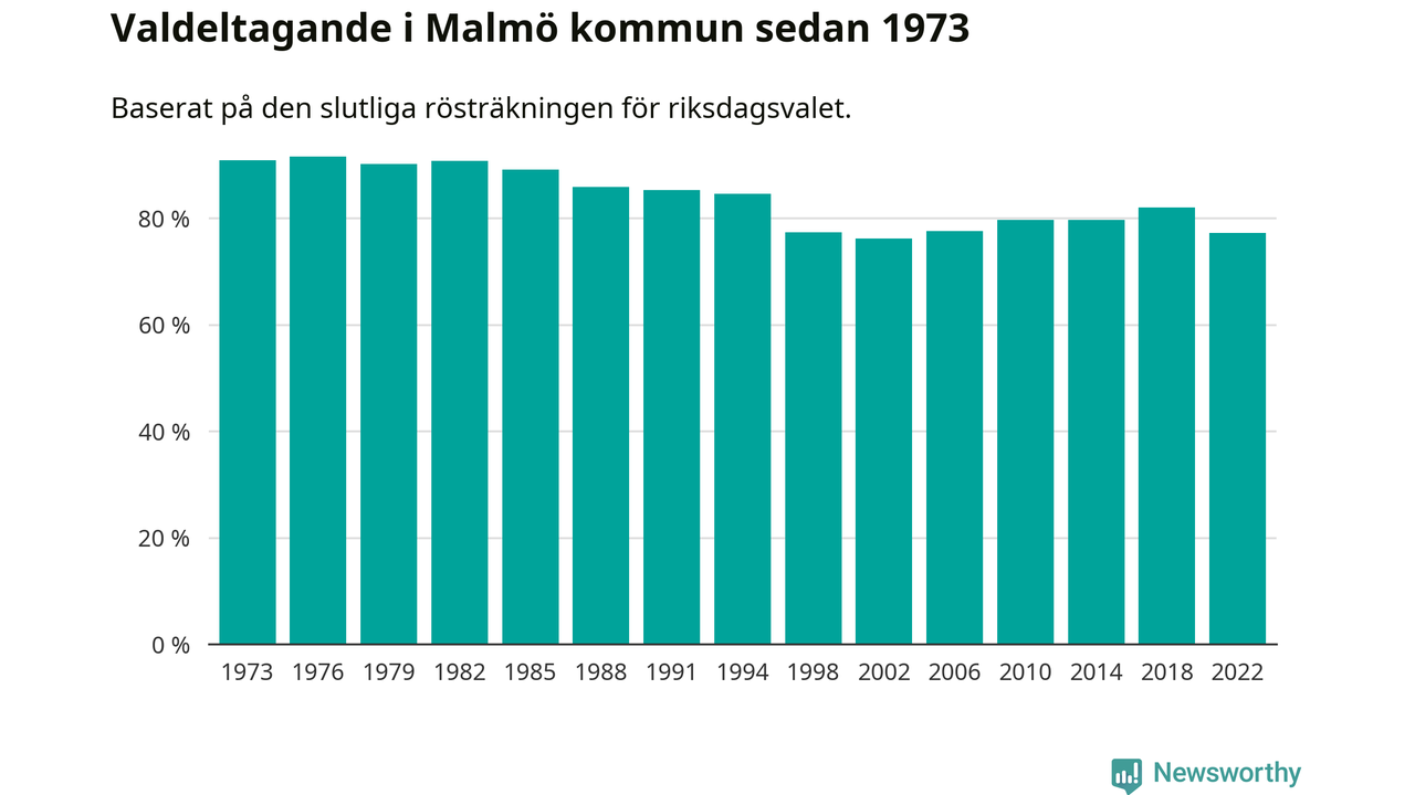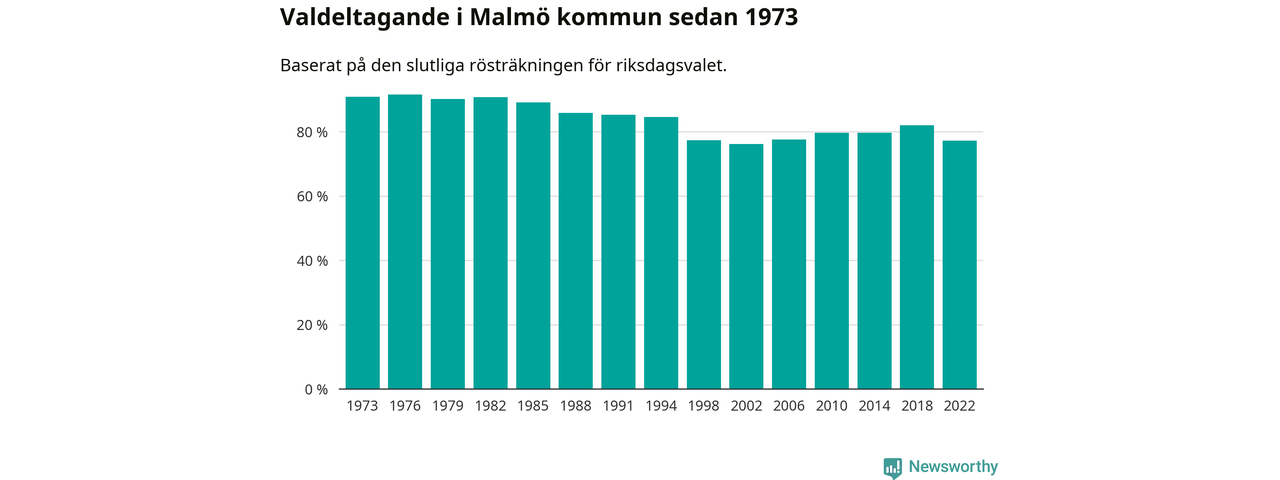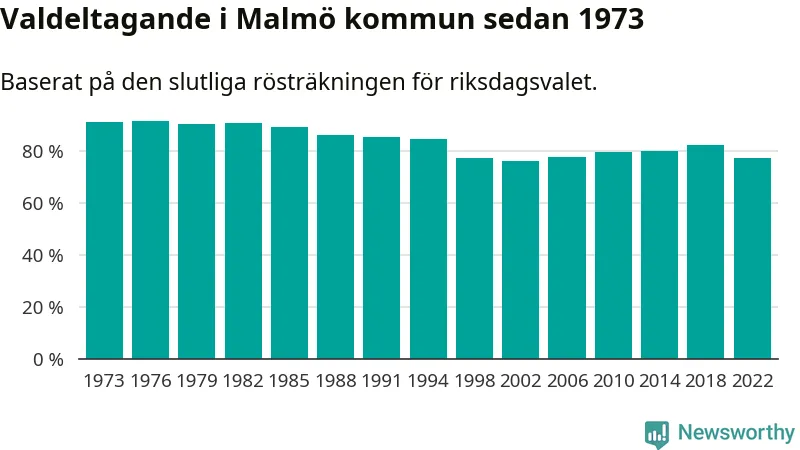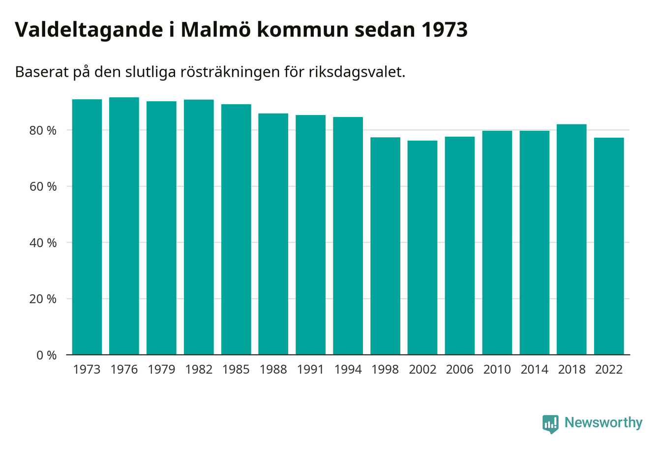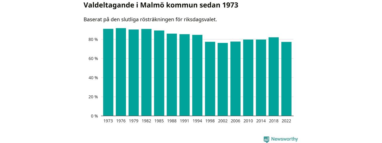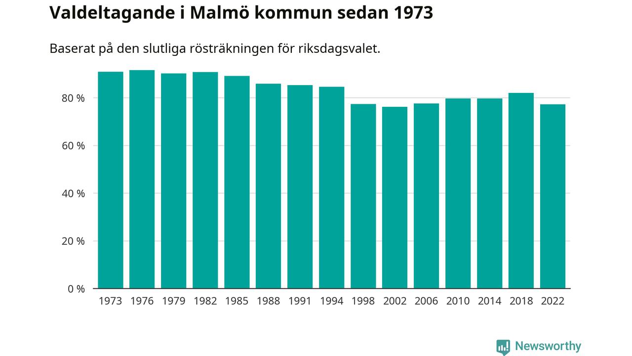 Malmö hade det femte lägsta valdeltagadet av alla kommuner i landet under 2022. Allra lägst var det i Haparanda kommun, där bara 69,1 procent röstade i riksdagsvalet. Högst valdeltagande noterades i Lomma kommun, 92,4 procent.