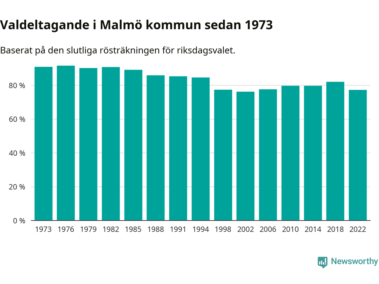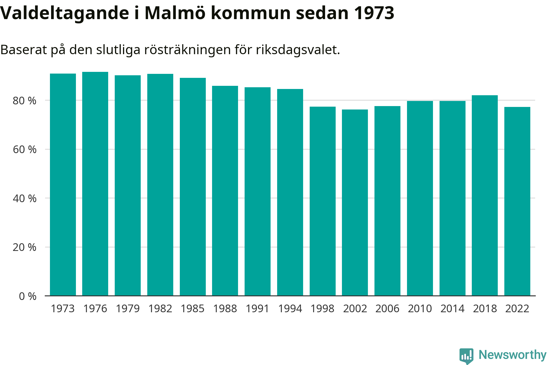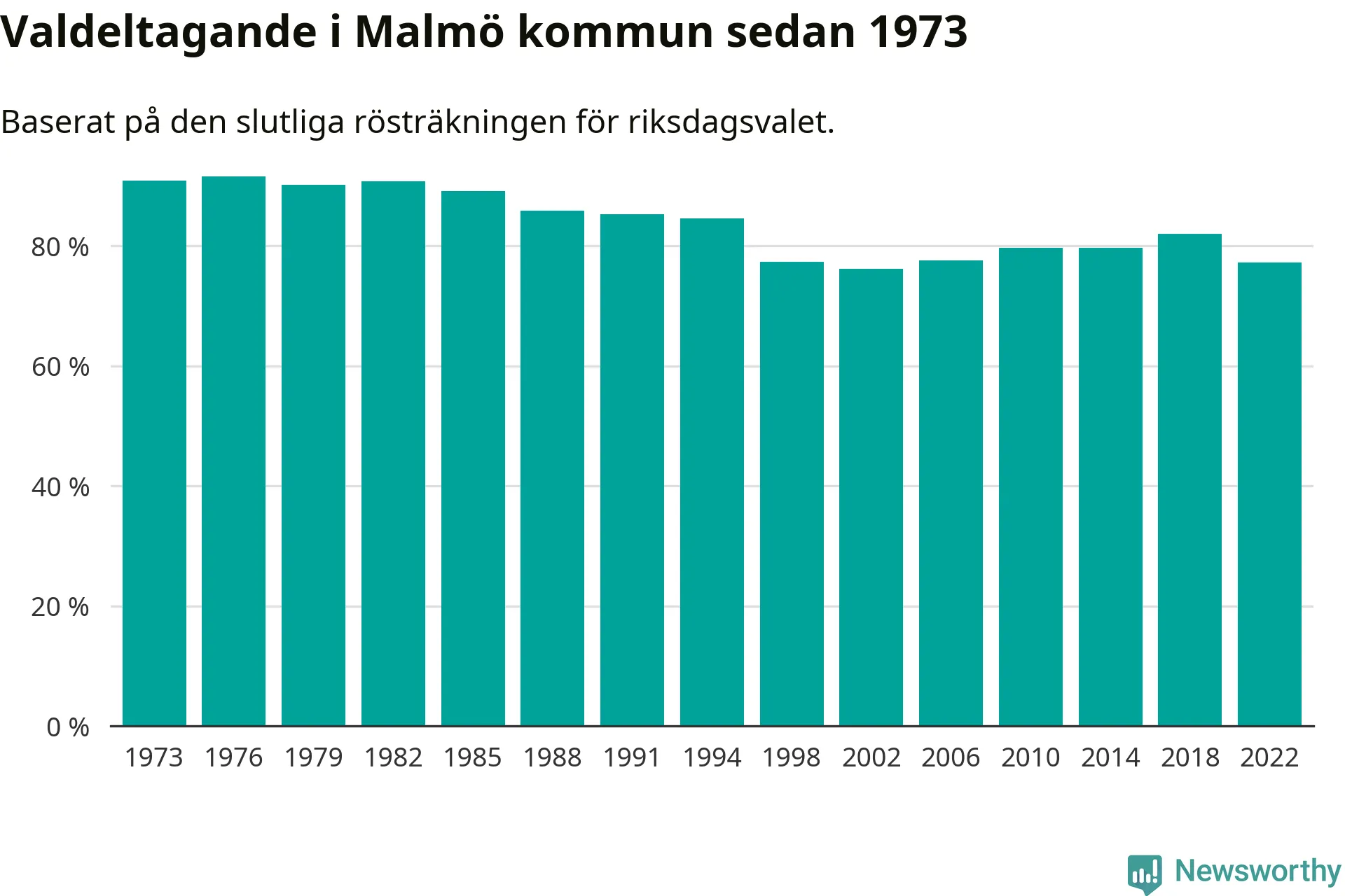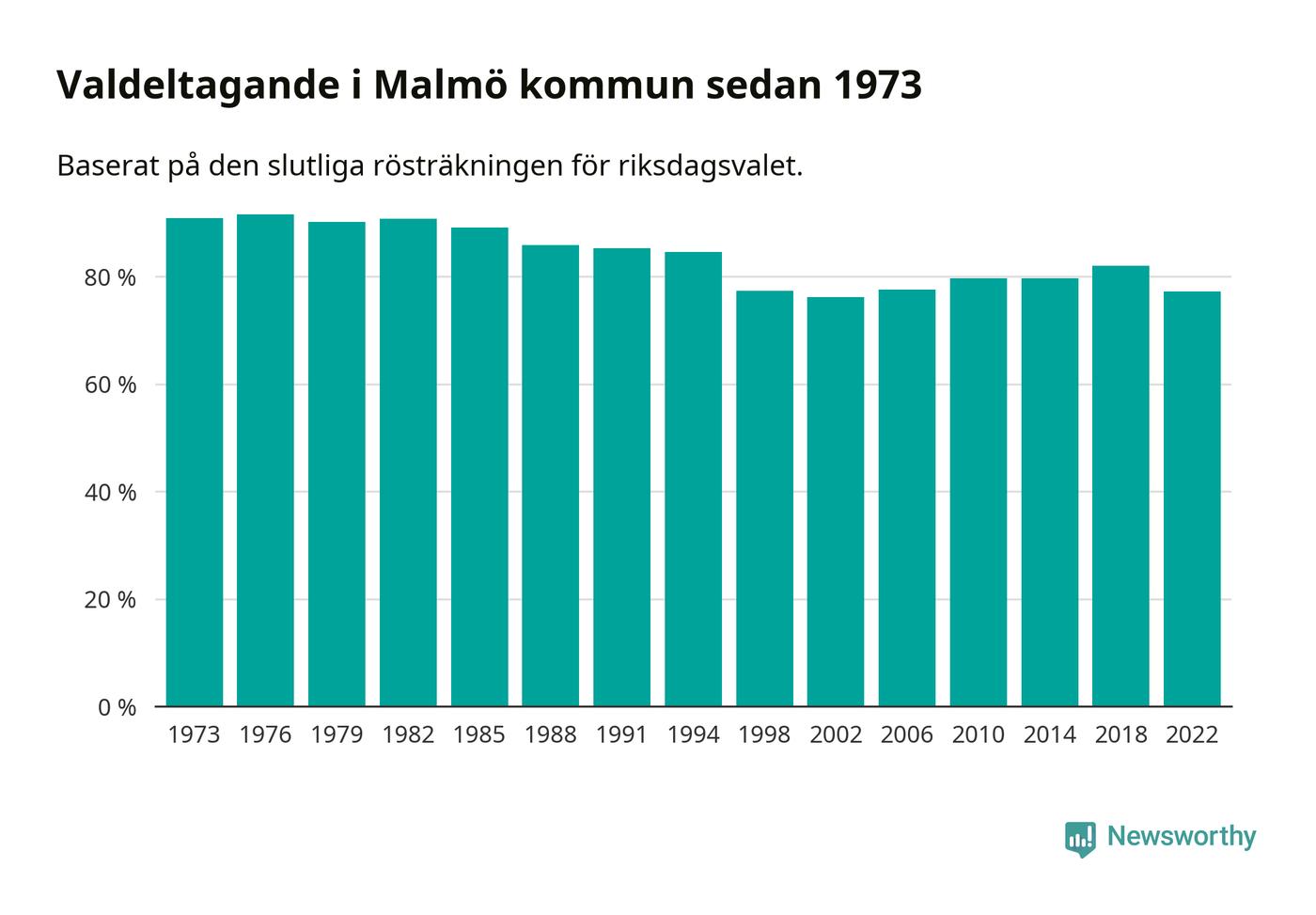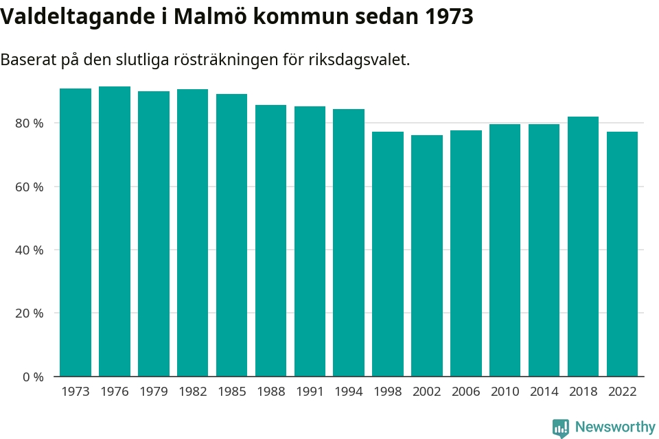 Malmö hade det femte lägsta valdeltagadet av alla kommuner i landet under 2022. Allra lägst var det i Haparanda kommun, där bara 69,1 procent röstade i riksdagsvalet. Högst valdeltagande noterades i Lomma kommun, 92,4 procent.