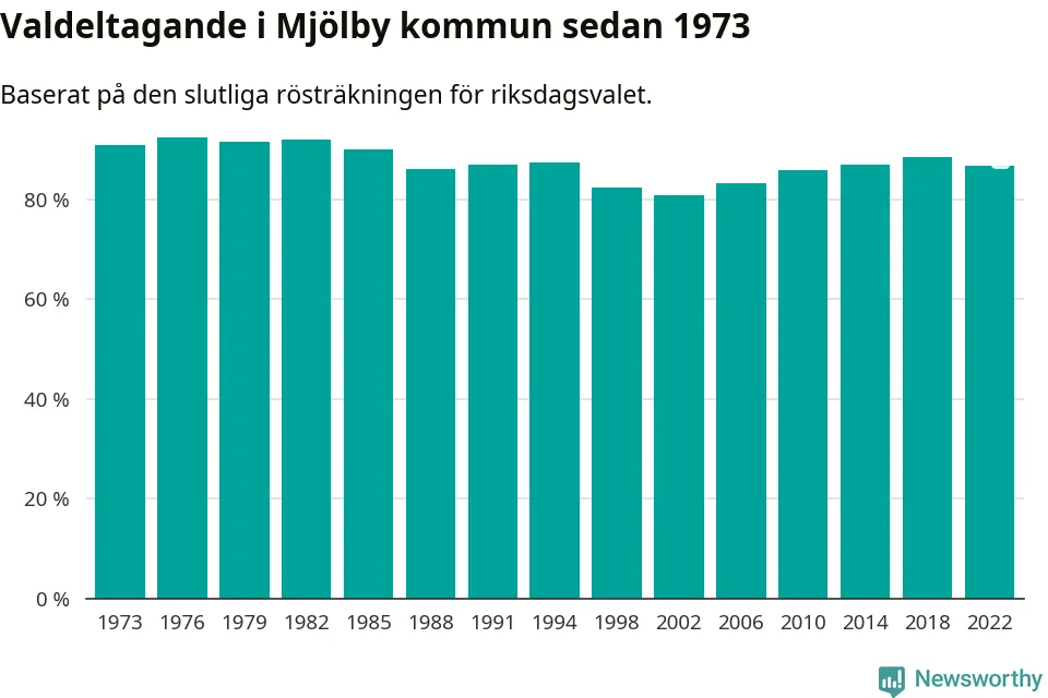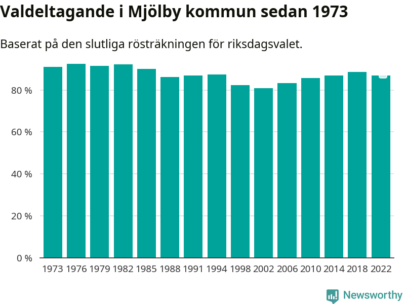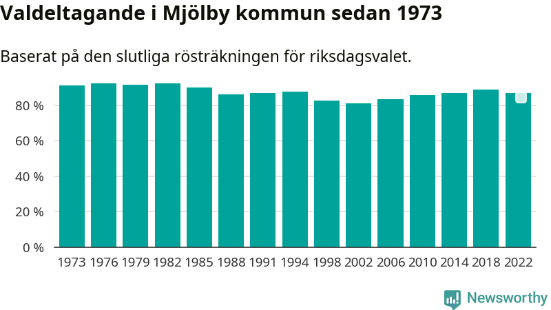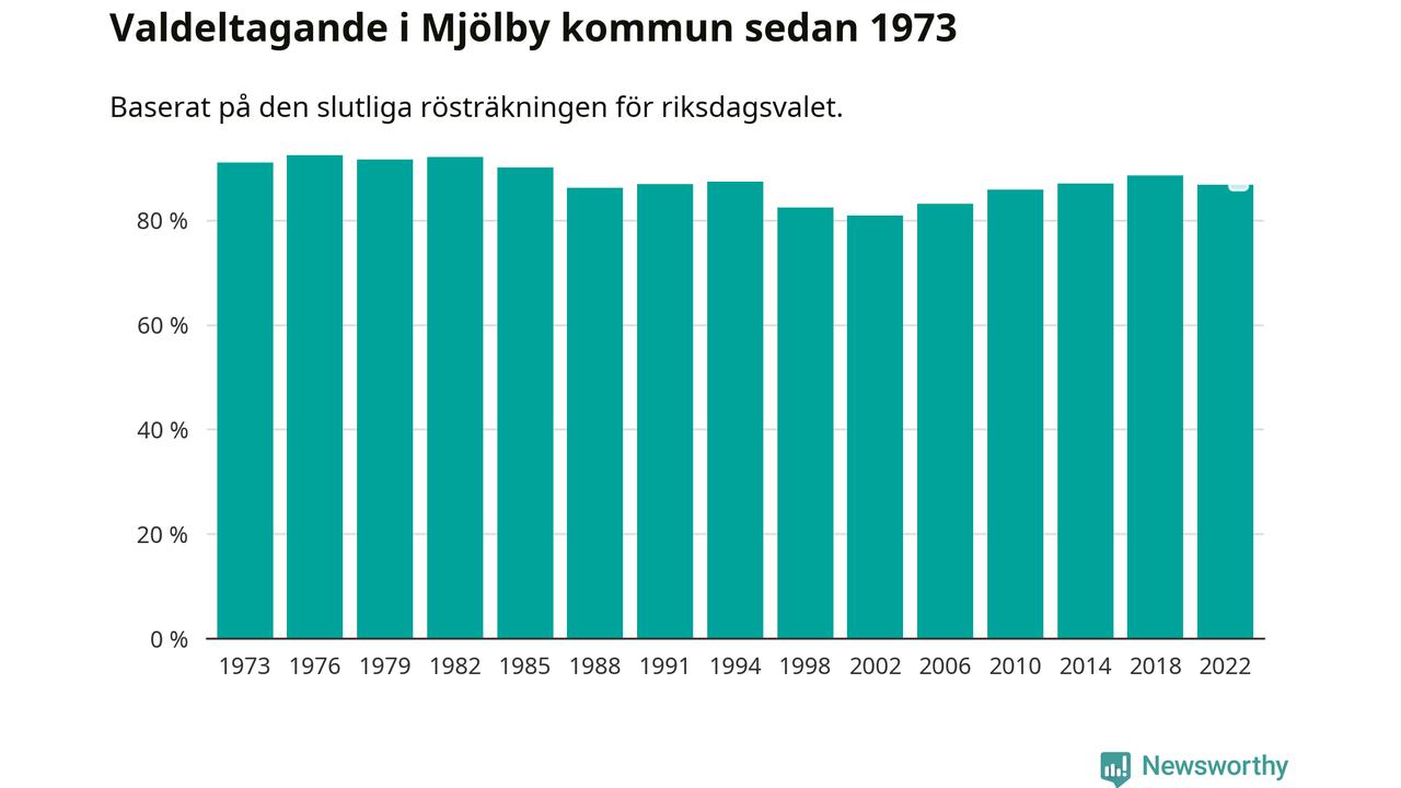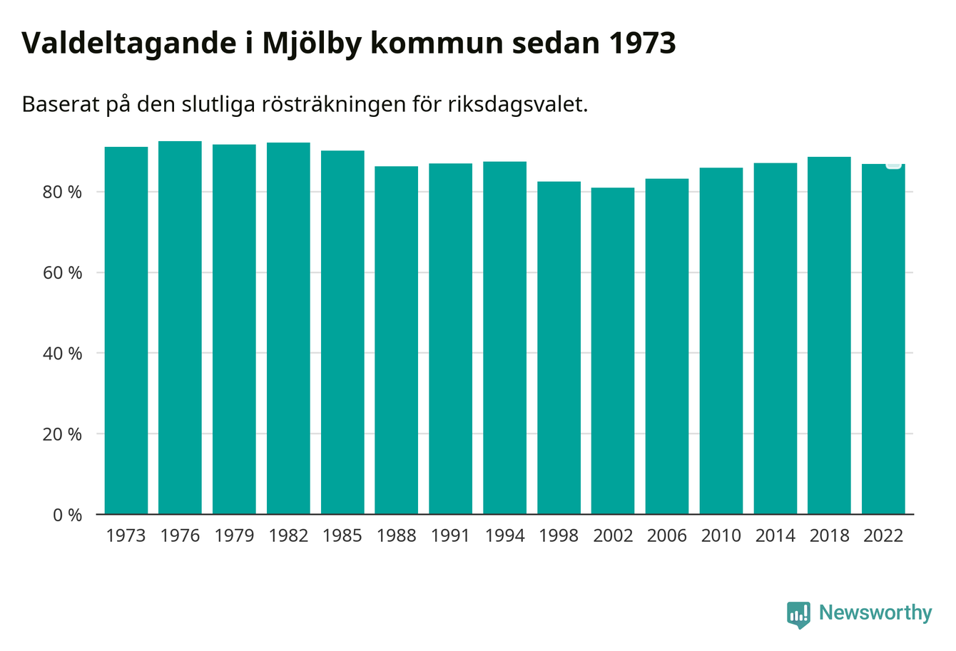 Mjölby tillhör Östergötlands läns valkrets. Där var valdeltagandet förra valet 85,3 procent. I hela riket landade valdeltagandet 2022 på 84,21 procent, att jämföra med 87,18 procent 2018.