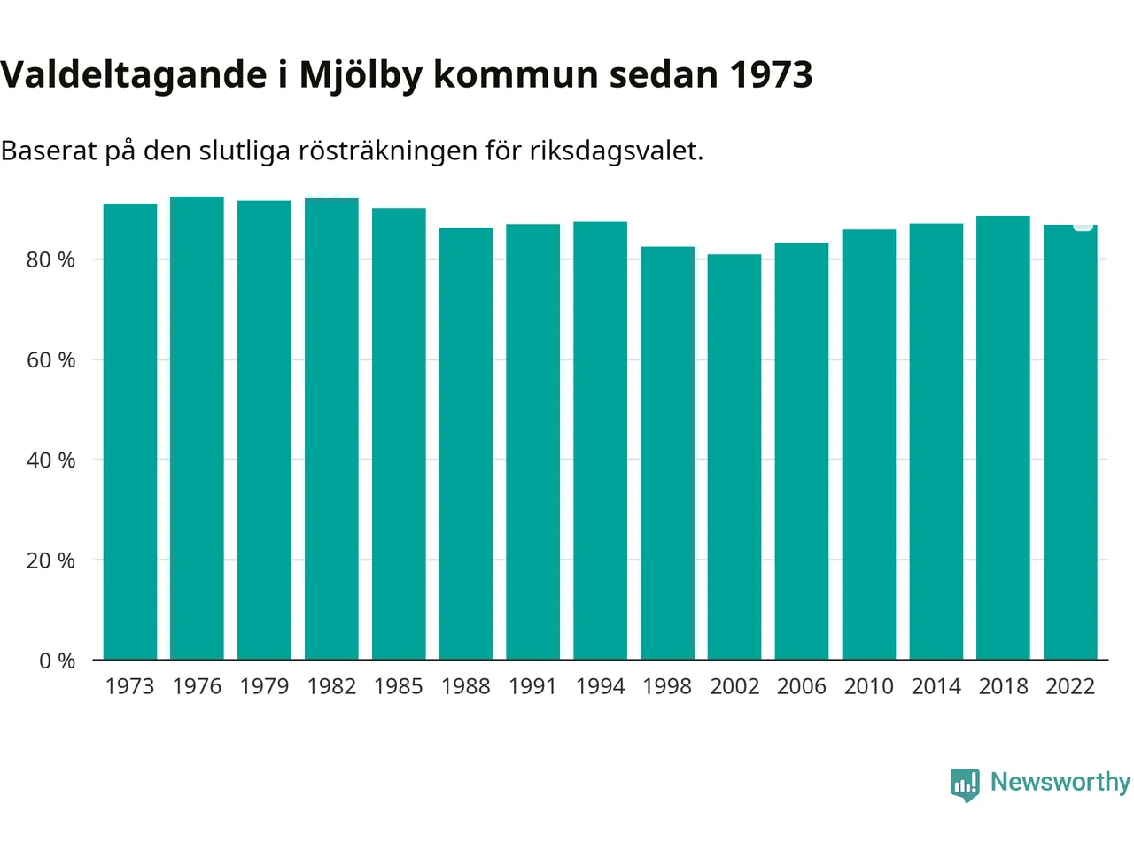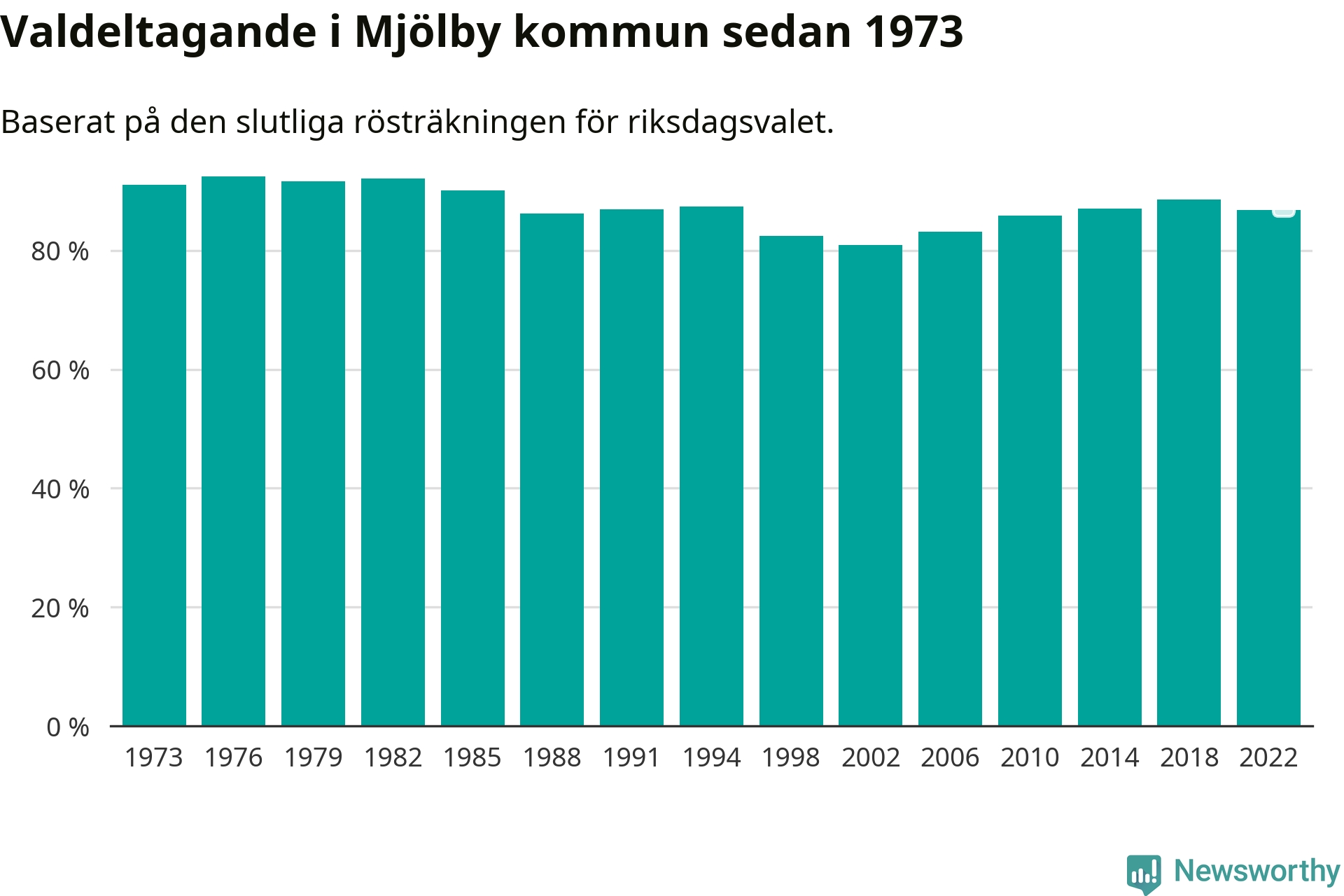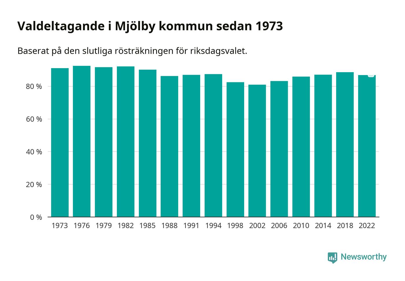 Mjölby tillhör Östergötlands läns valkrets. Där var valdeltagandet förra valet 85,3 procent. I hela riket landade valdeltagandet 2022 på 84,21 procent, att jämföra med 87,18 procent 2018.